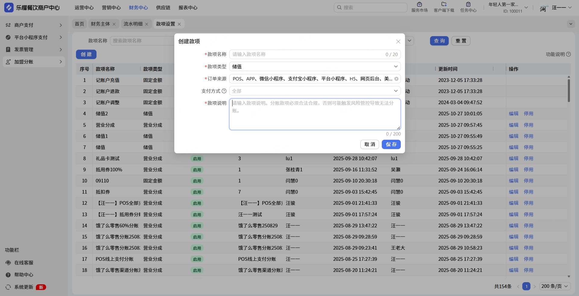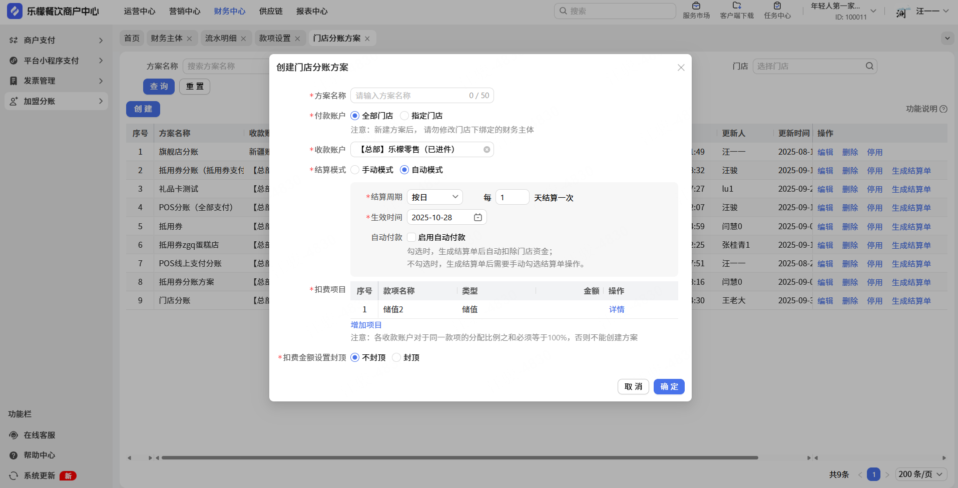 2.门店分账方案支持选择储值类型的款项,目前限制同一个方案只能选择一个储值类型的款项。