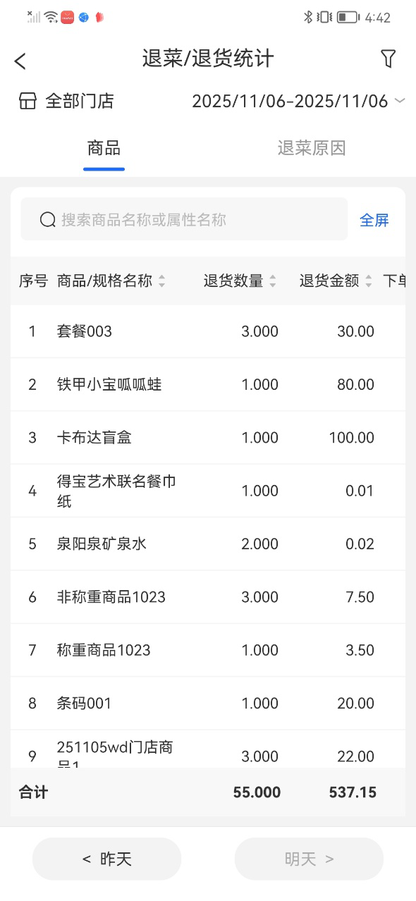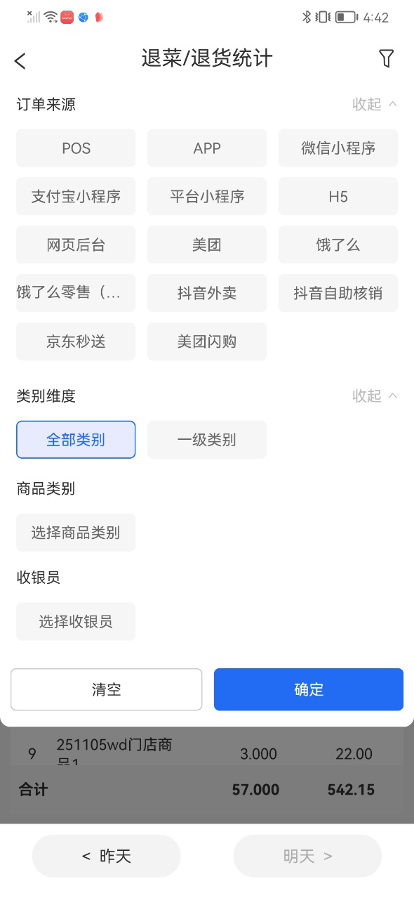 APP统计时,如果选择多个门店,会把多个门店的退菜/退货数据合并展示。