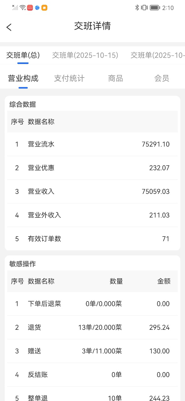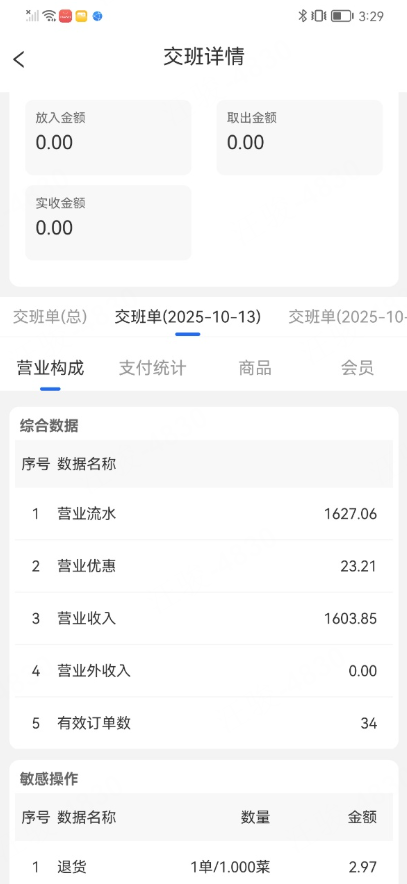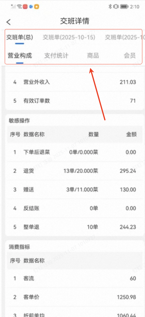 2.交班统计详情页上下滚动时,营业统计/支付统计/商品/会员数据会固定在顶部。方便切换。