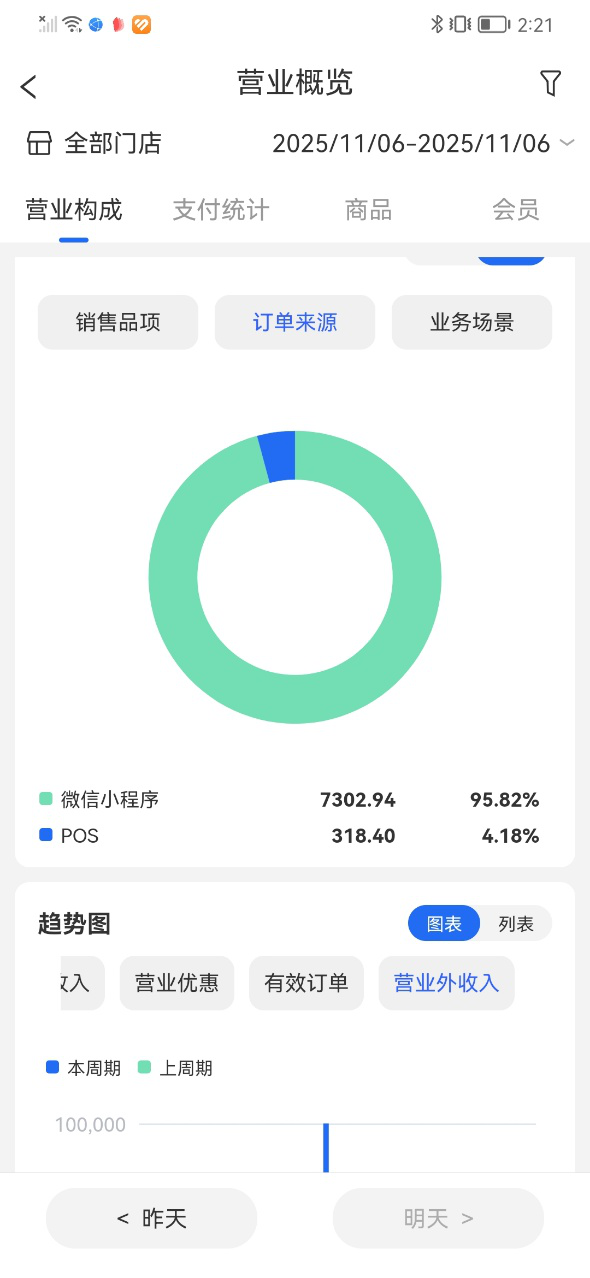 趋势图包括:营业收入、营业优惠、有效订单数、营业外收入