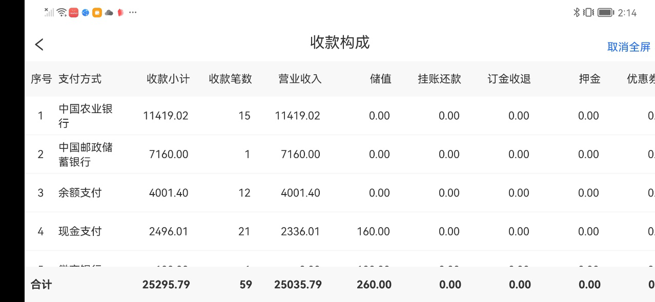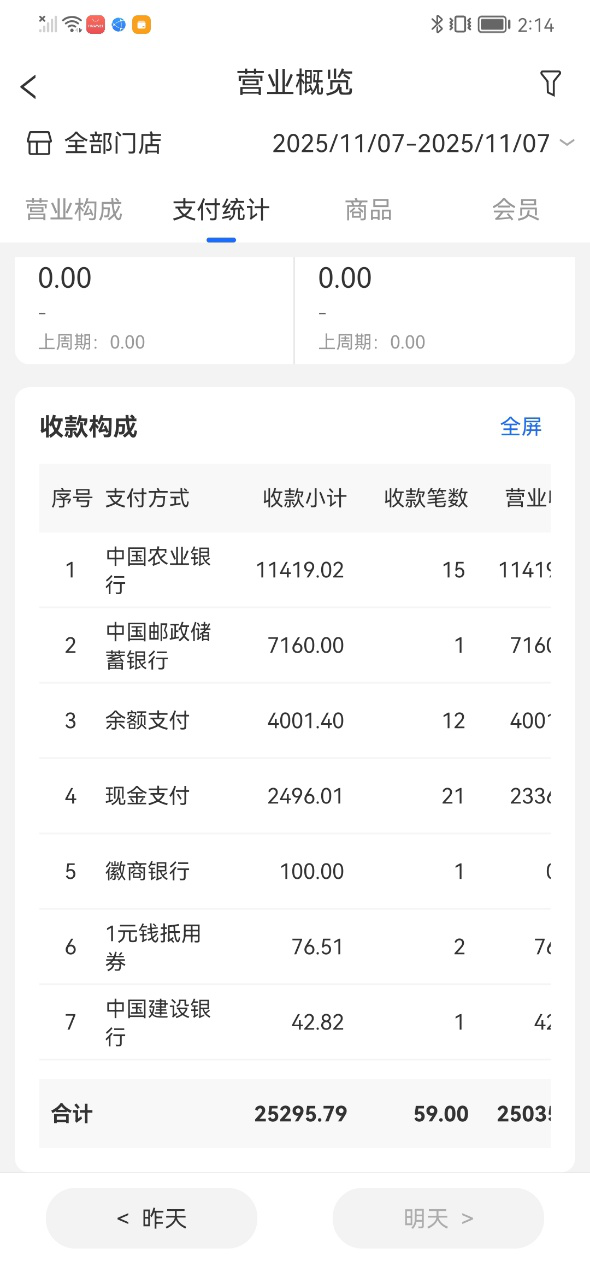 3.支付统计中,收款构成直接展示所有类型的支付数据,支持左右滚动查看。增加全屏及合计,增加报表说明。就餐方式改名业务场景,其中扫码买单需要单独统计。