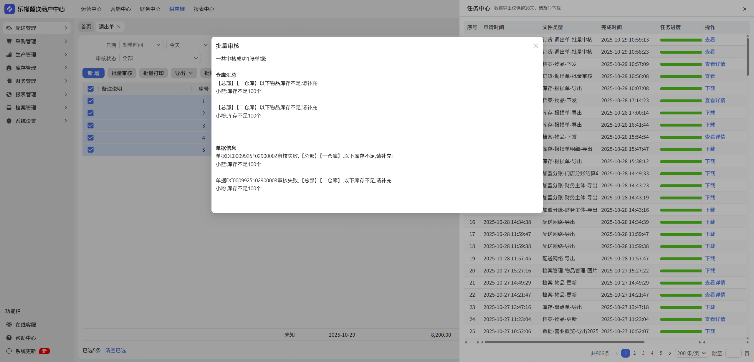 批量审核时,若出现库存不足而导致调出失败的情况,增加仓库缺货的汇总信息