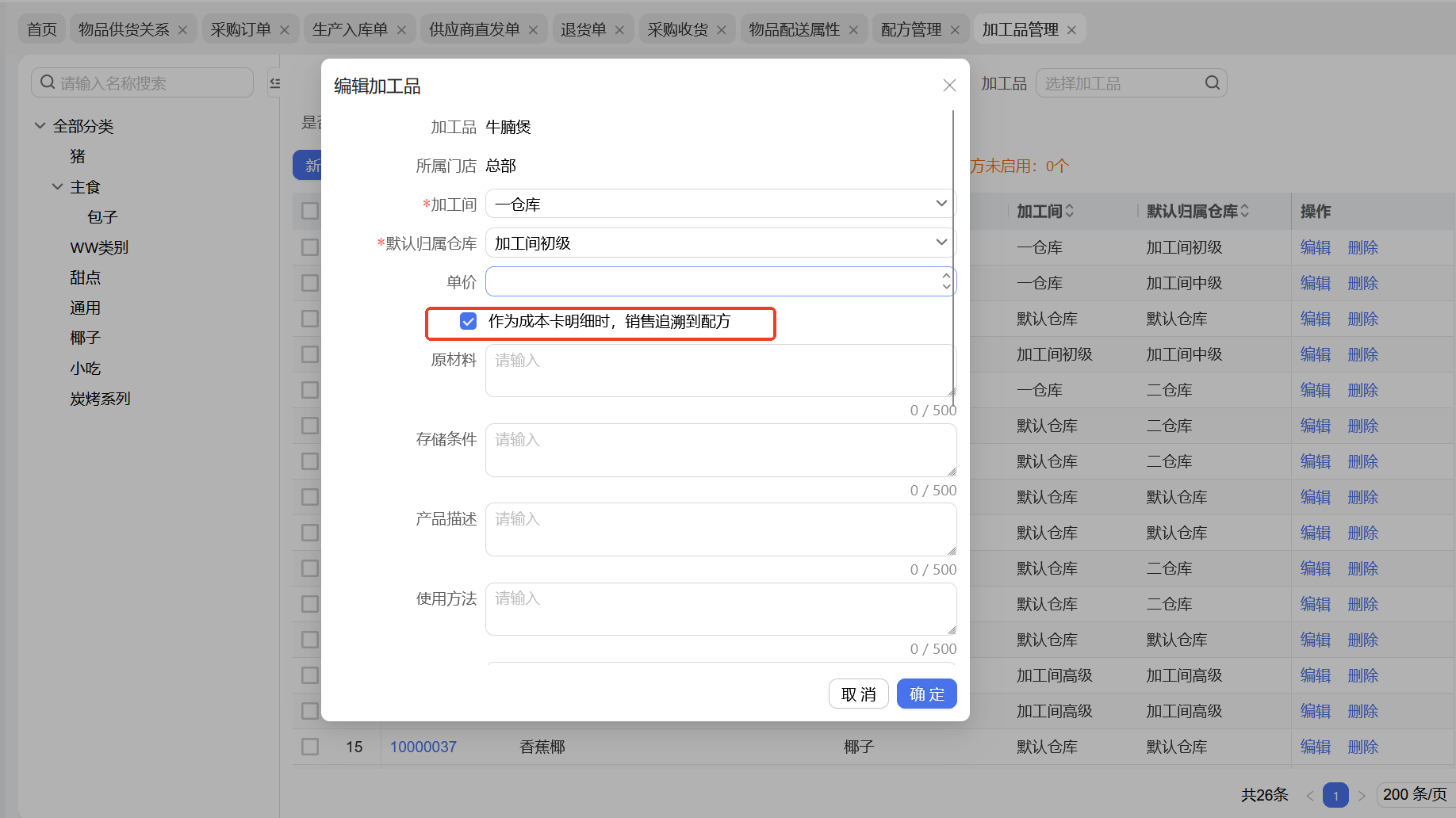 加工品管理增加参数:作为成本卡明细时,销售追溯到配方