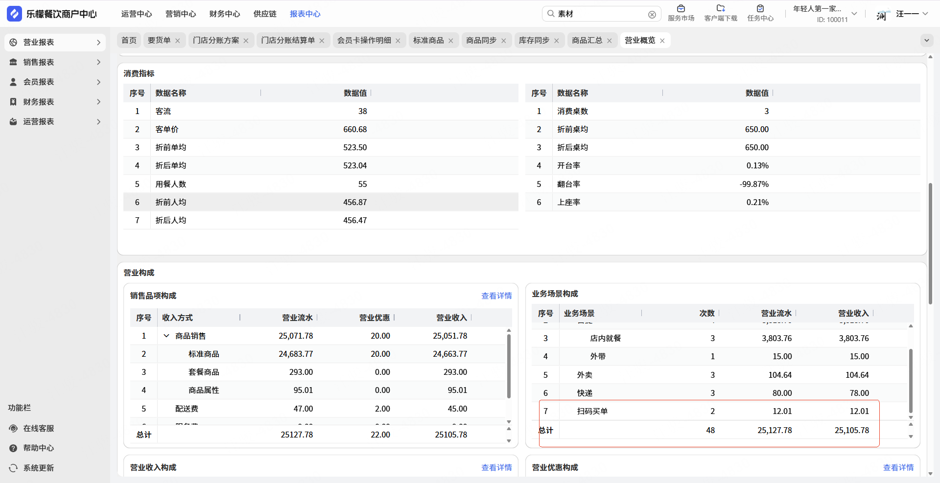 营业概览、营业统计、营业明细、营业优惠分析、营业退款统计、餐时段营业统计、商品汇总、商品销售汇总、商品销售明细、商品门店销售汇总、退菜退货统计
