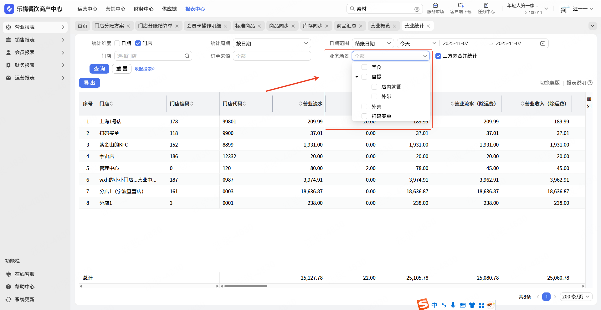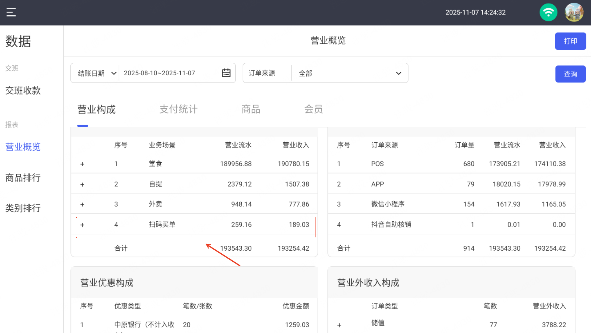 1.业务场景中,扫码买单数据单独统计。包括以下报表: