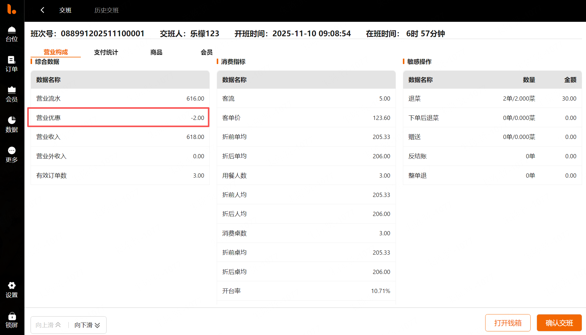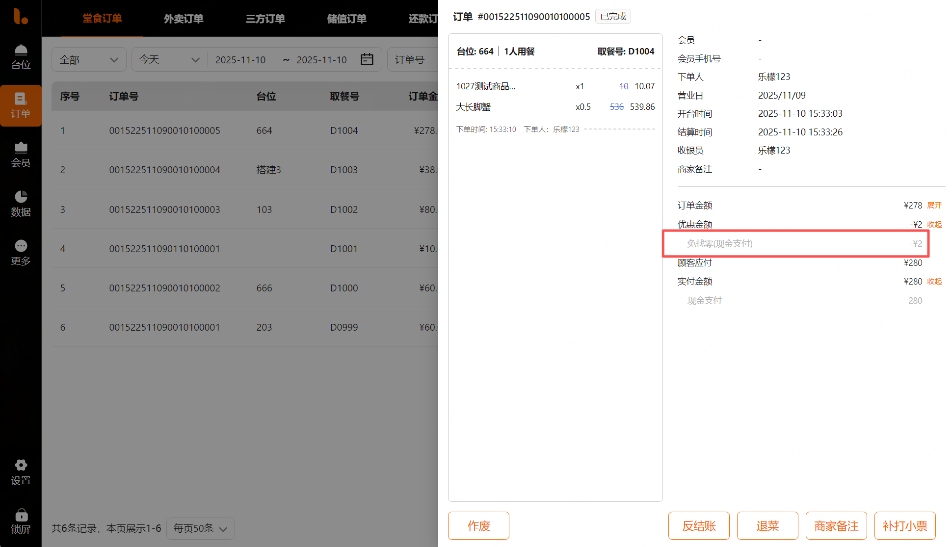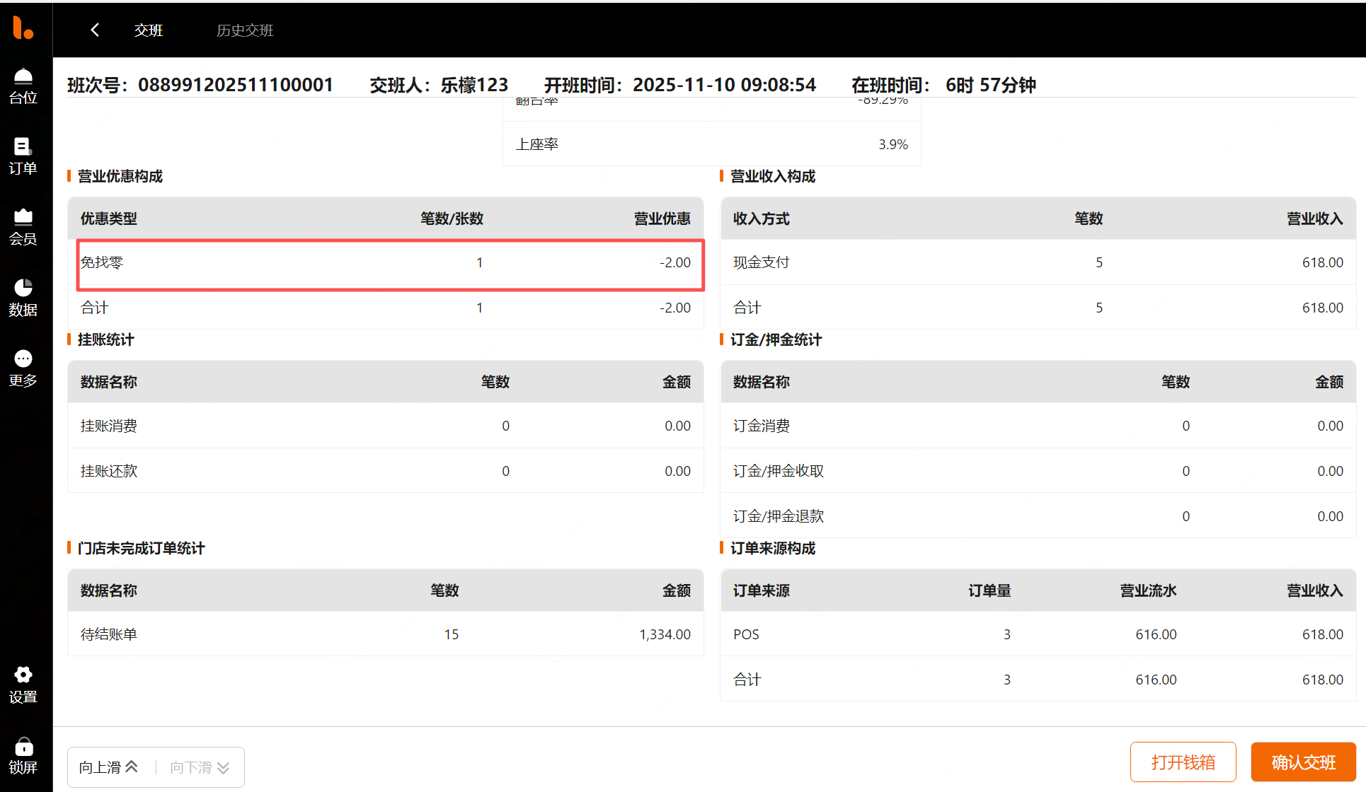 免找零金额计为优惠方式,在做数据报表中,均按正向优惠值处理(商家多收钱)