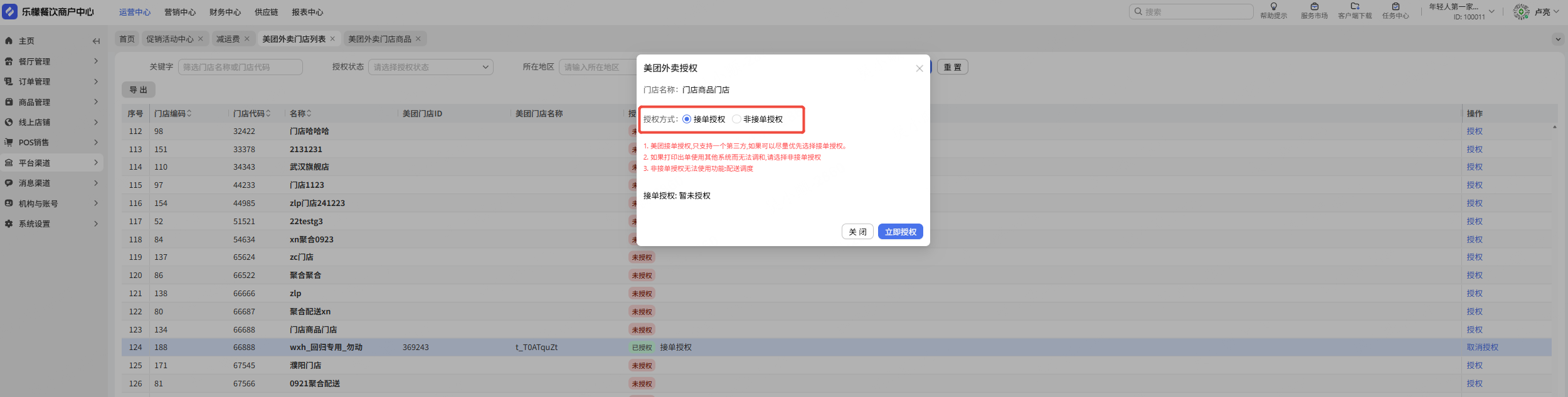 美团外卖门店列表,授权方式调整为接单授权和非接单授权;
