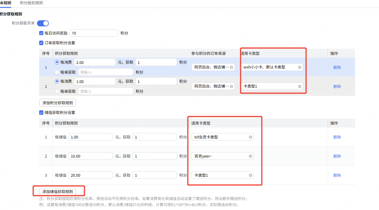 储值获取积分设置,支持添加多个。
