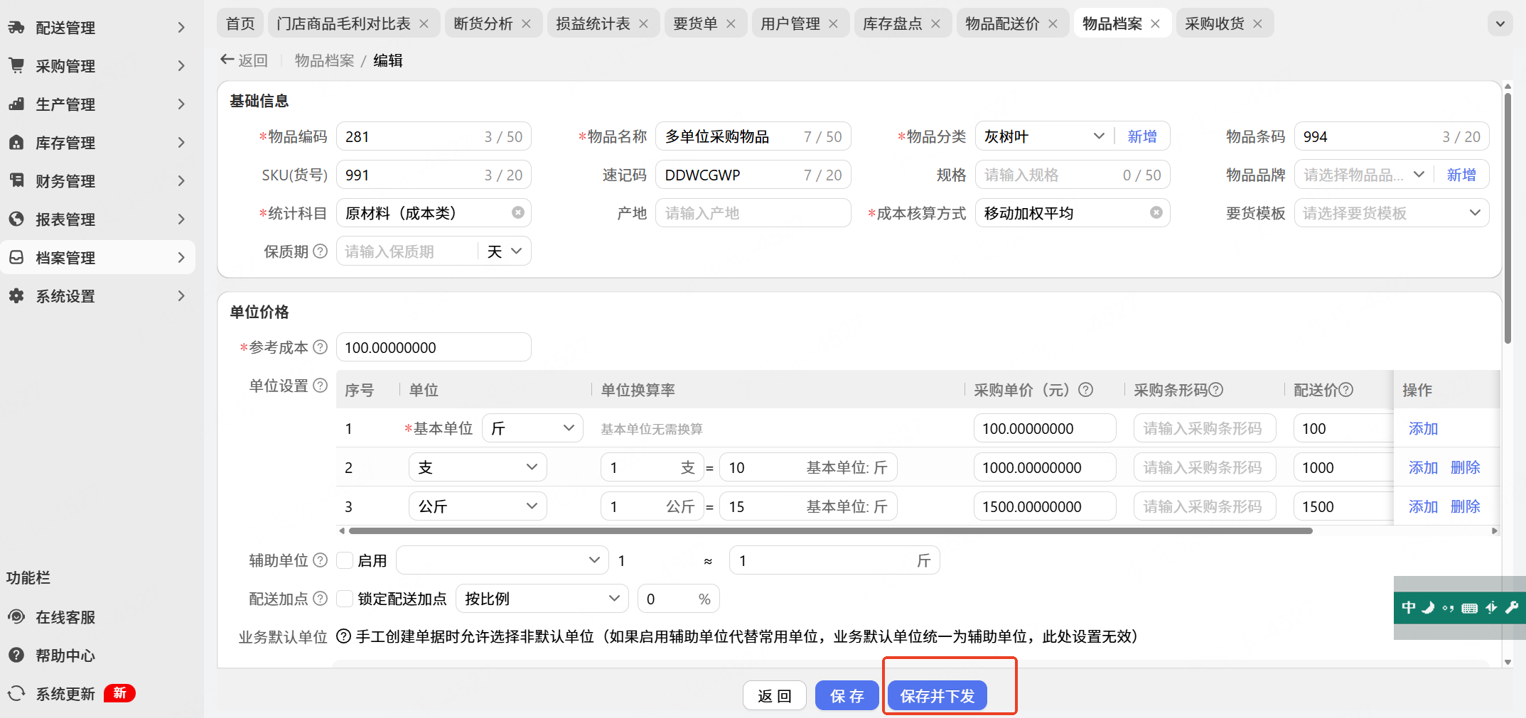 创建/编辑物品后,增加保存并下发功能,可快速保存并下发