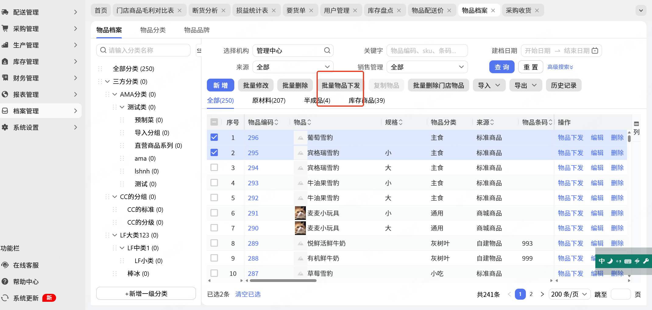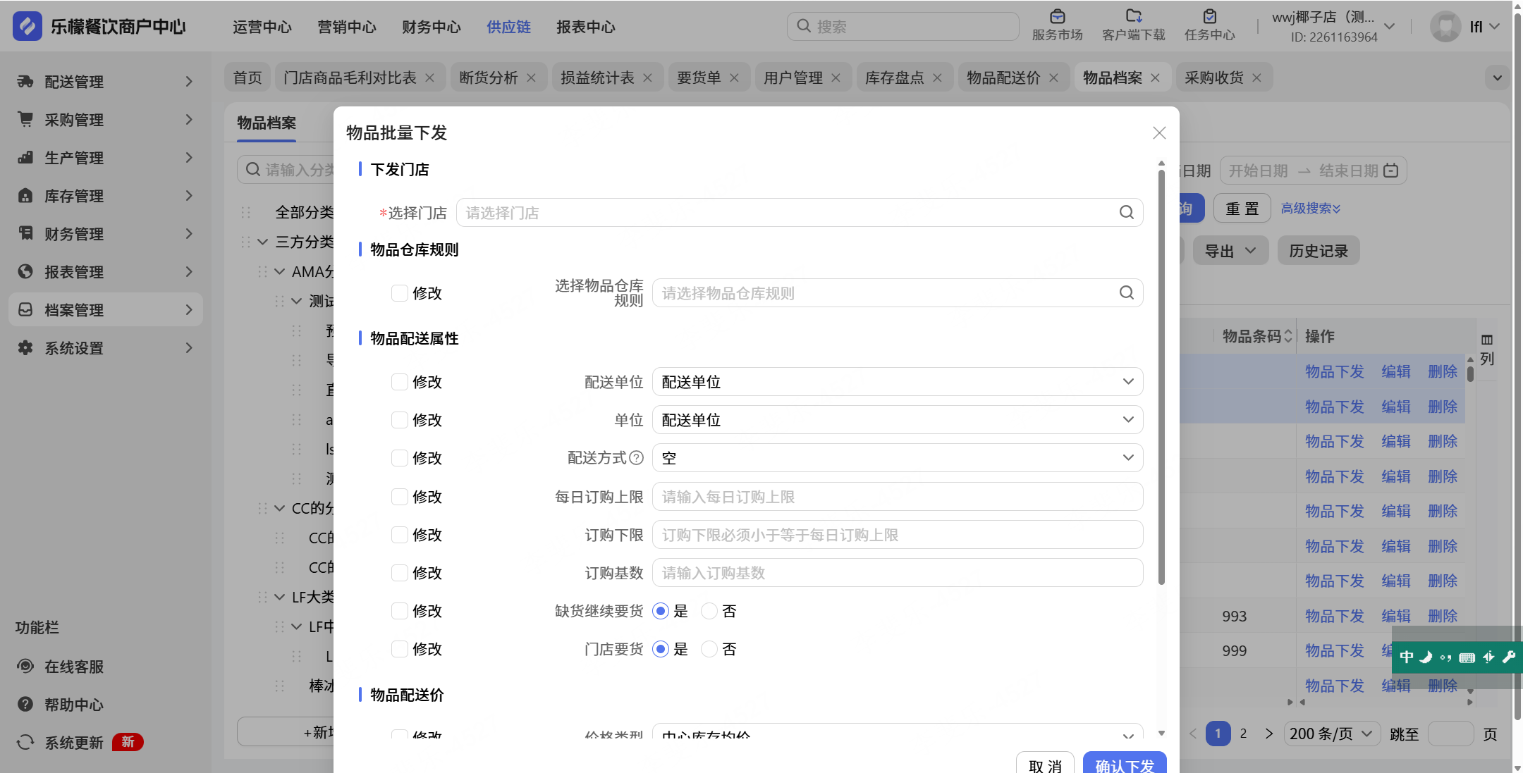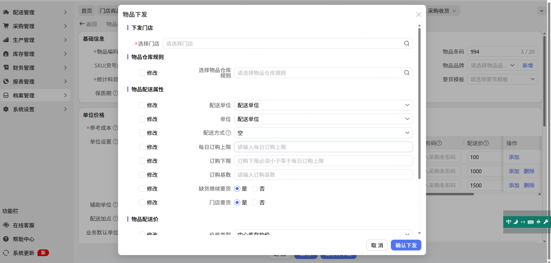 点击保存并下发,可选择需要下发的门店,及需要修改的内容,支持修改物品仓库规则及物品配送属性