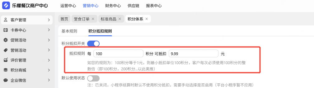 如您的规则为:最小抵扣单位100积分,100积分等于1元,则客户每次必须使用100积分的整数倍(即100积分,200积分...以此类推)