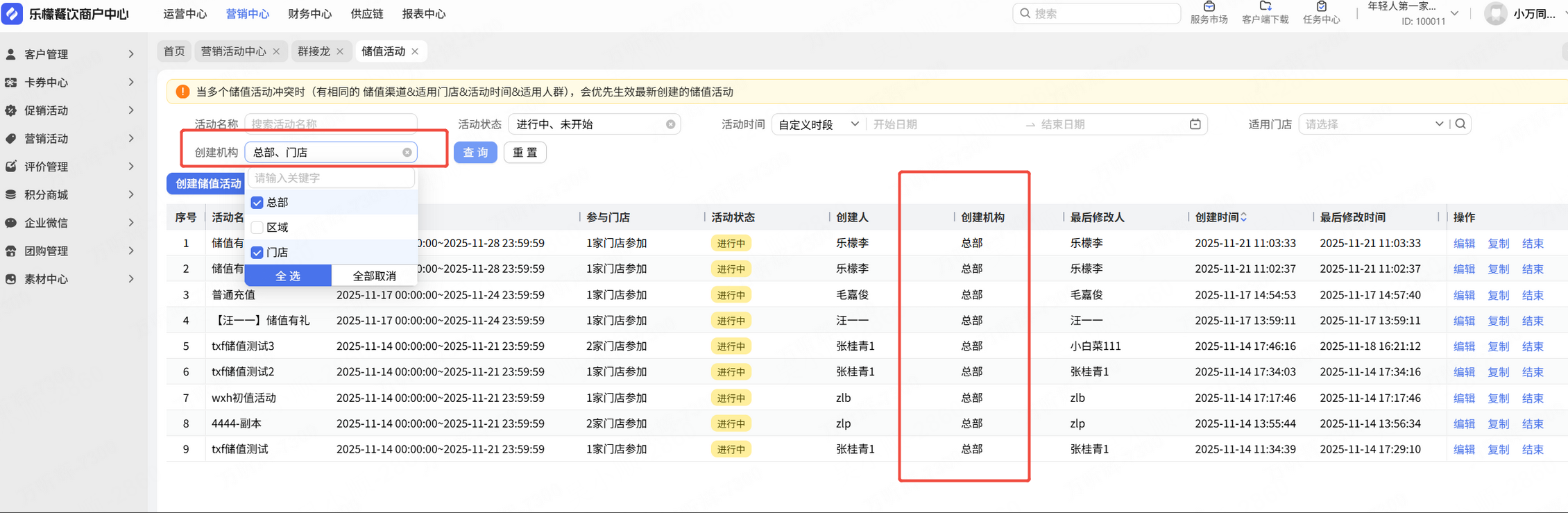 总部视角、门店视角、区域视角,促销活动列表页,查询条件增加:创建机构;可选:全部、总部、区域、门店。