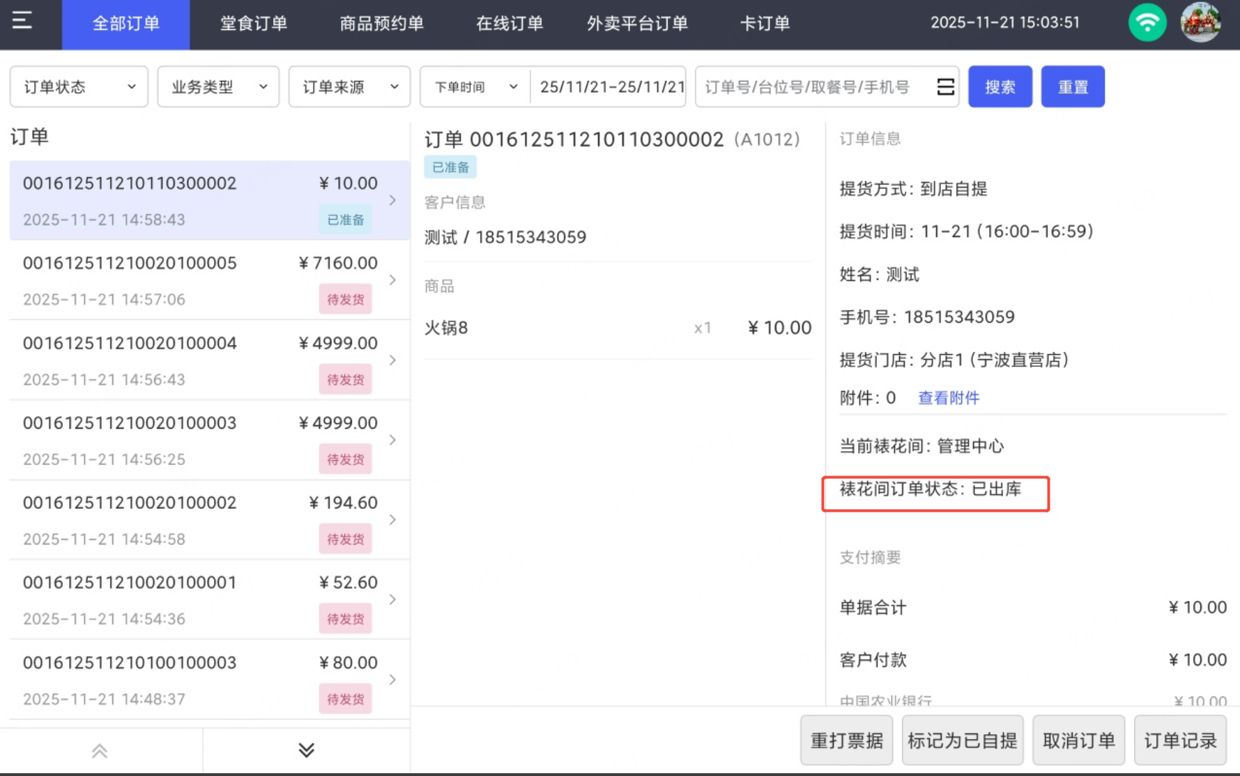 原制作完成的配送单里,呼叫骑手和取消呼叫的功能,移到已出库的订单中。POS端,商品预约单-裱花间订单状态同步显示。