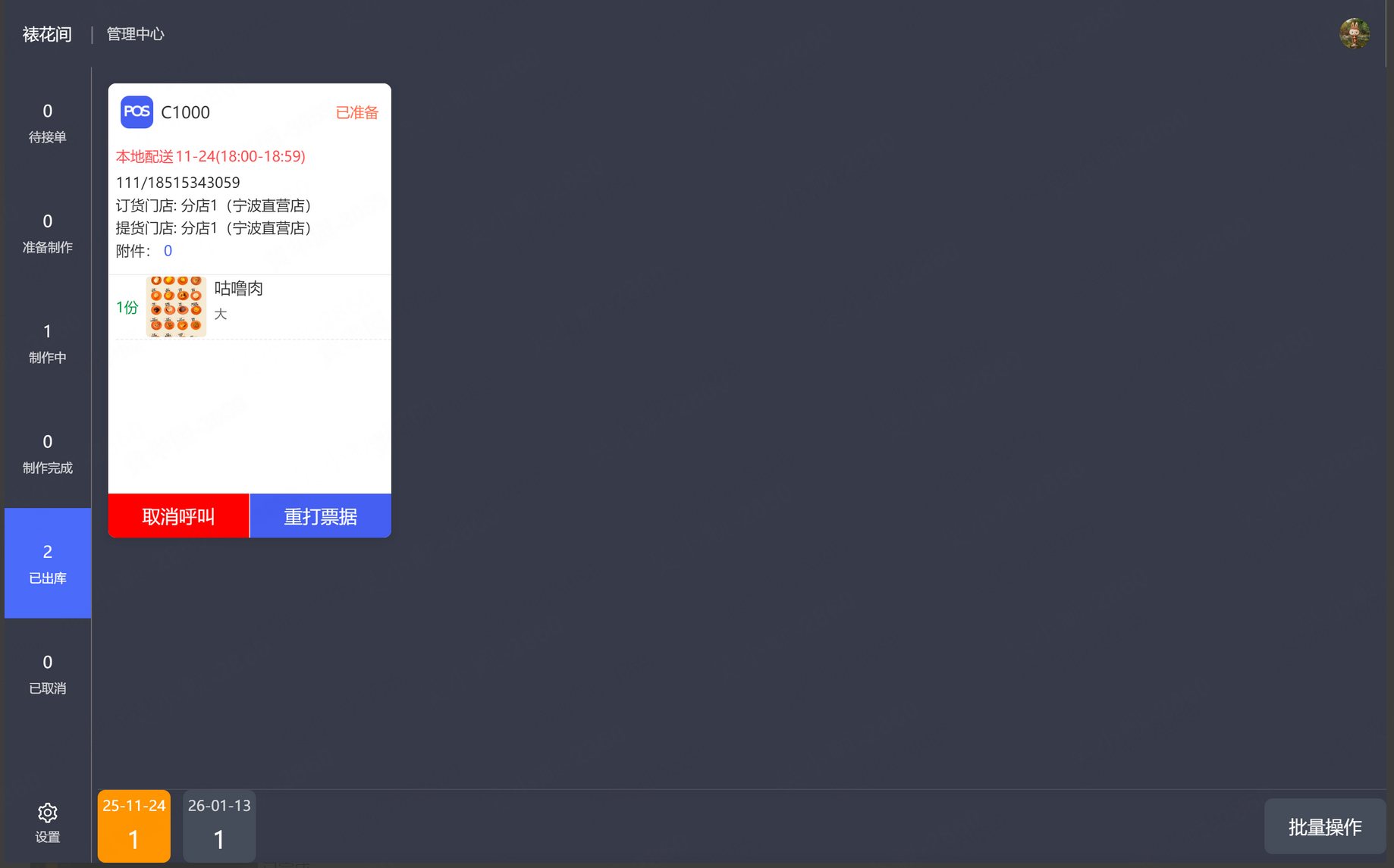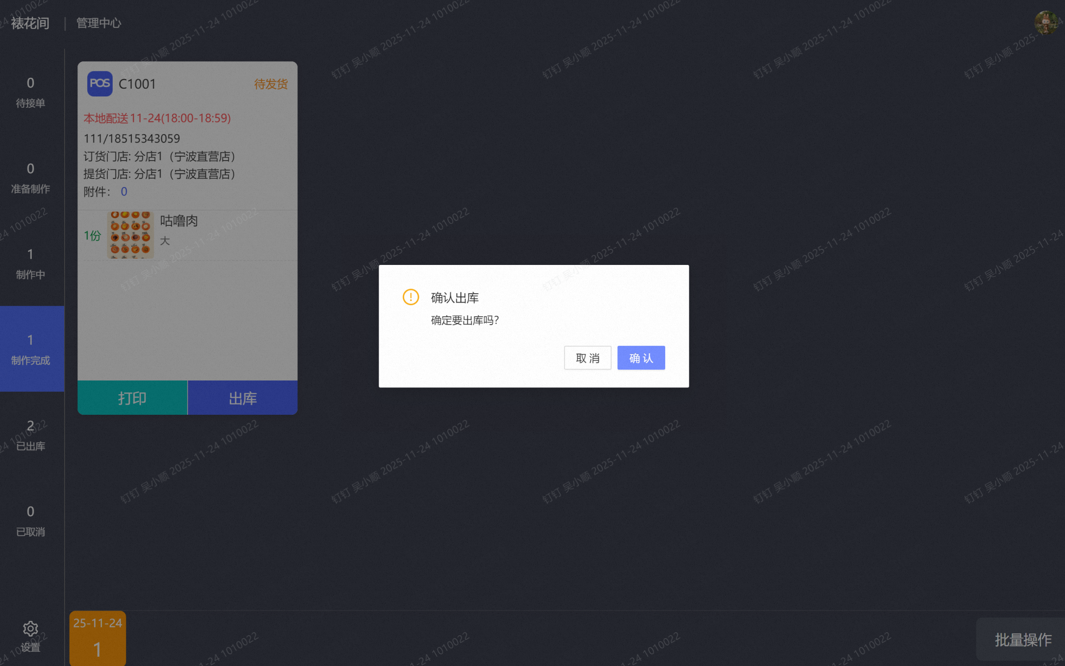 制作完成状态时,可以点击出库,二次确认后到已出库状态