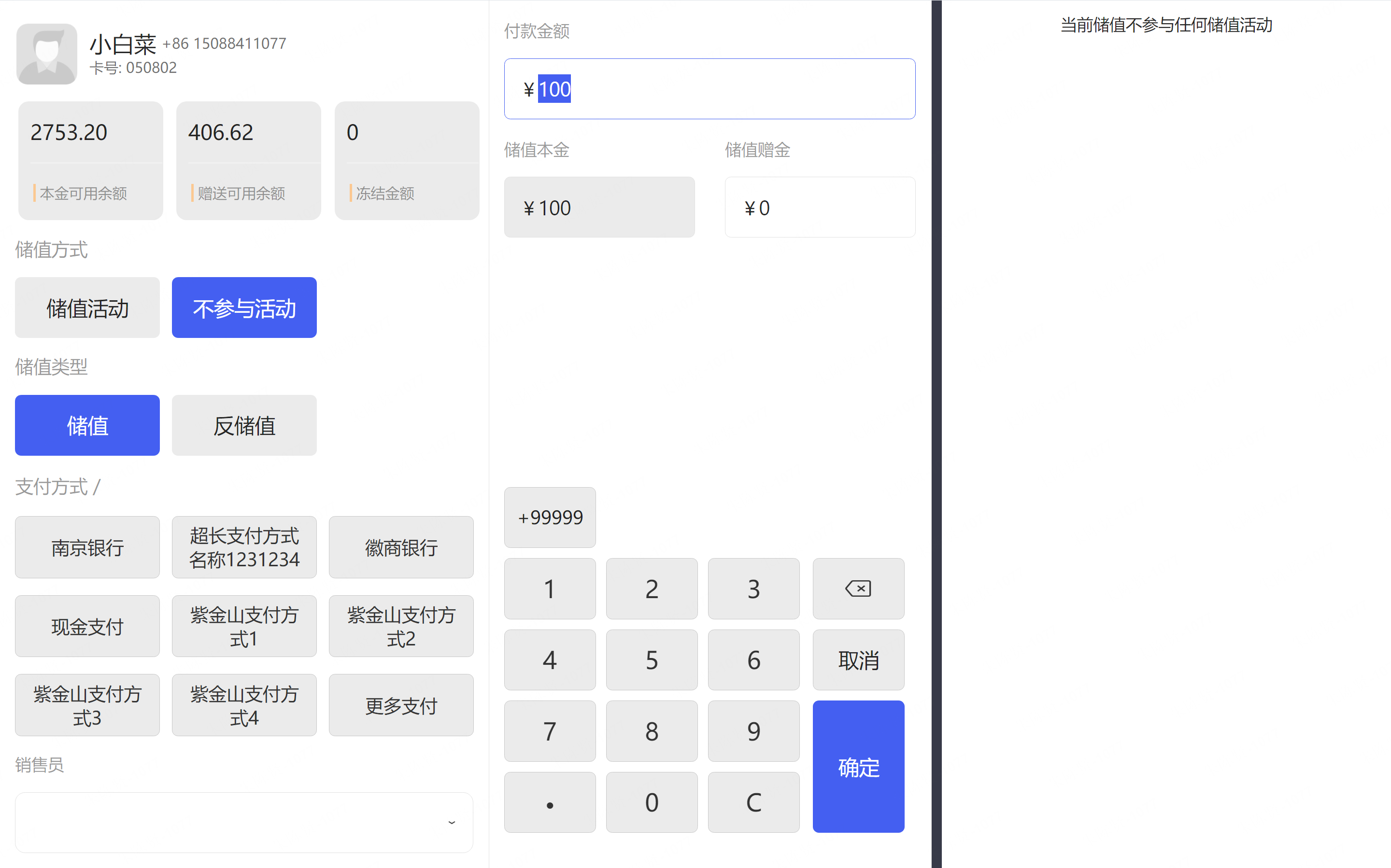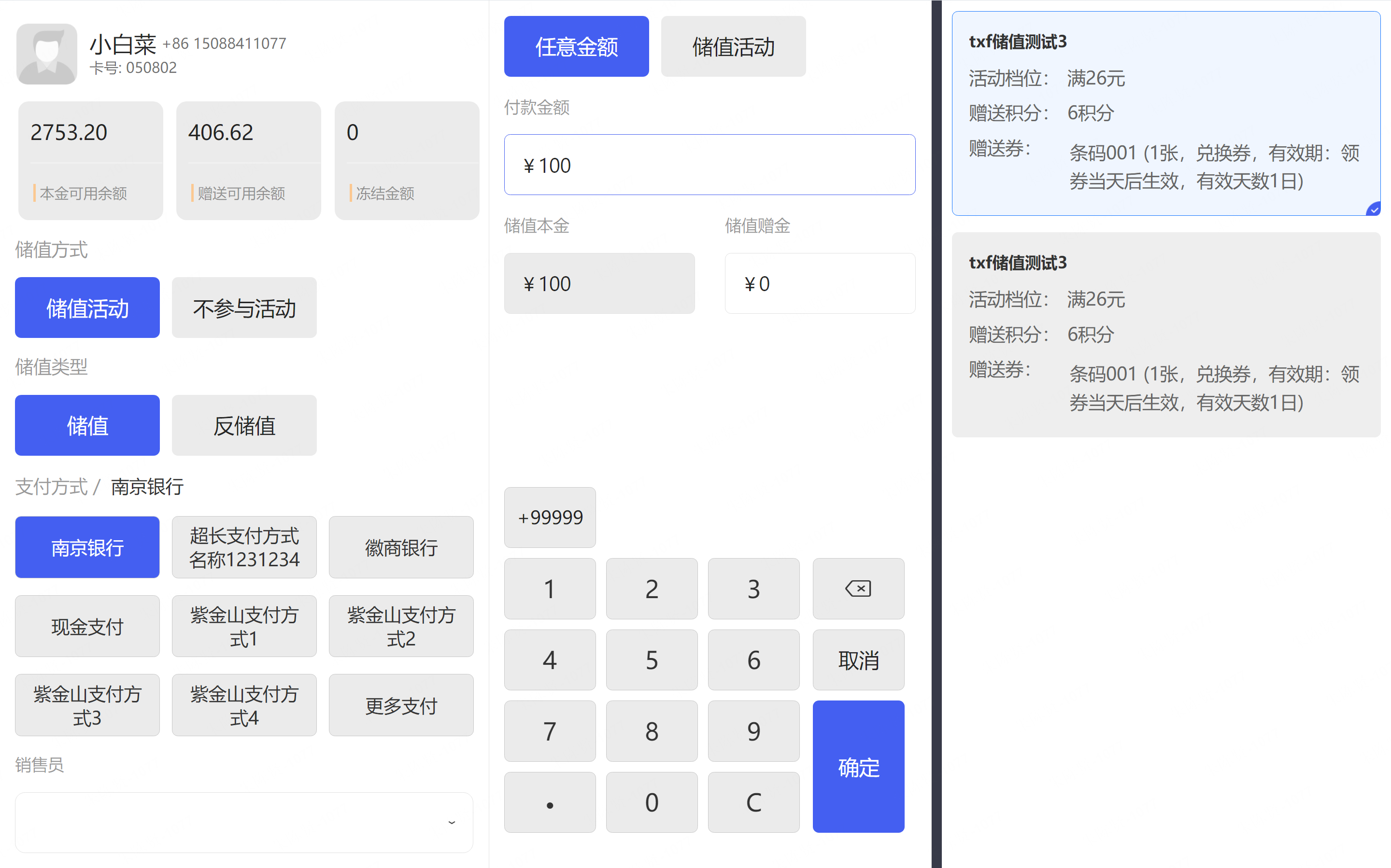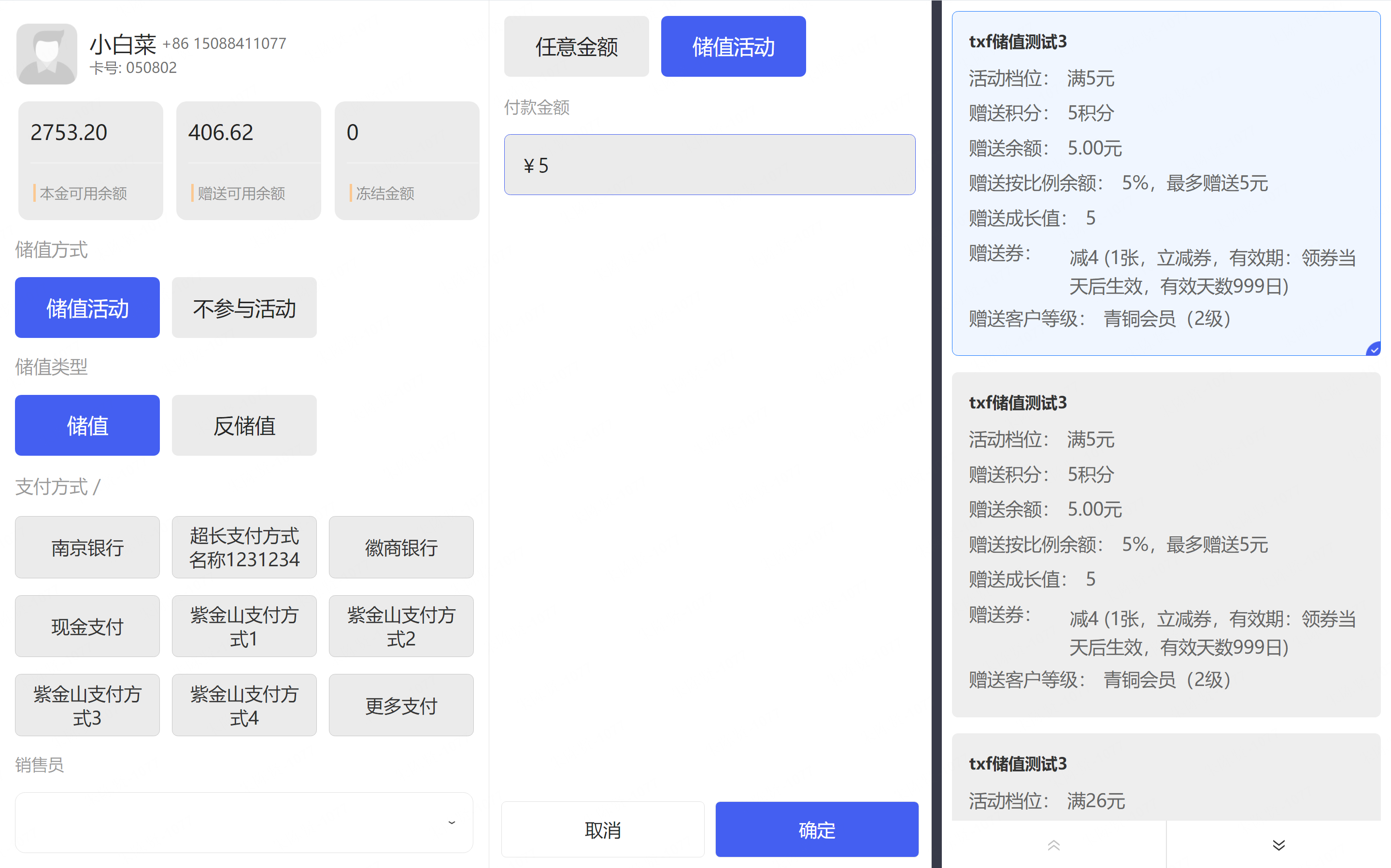 按活动储值:支持任意金额储值,根据付款金额匹配储值活动(允许手工取消活动)