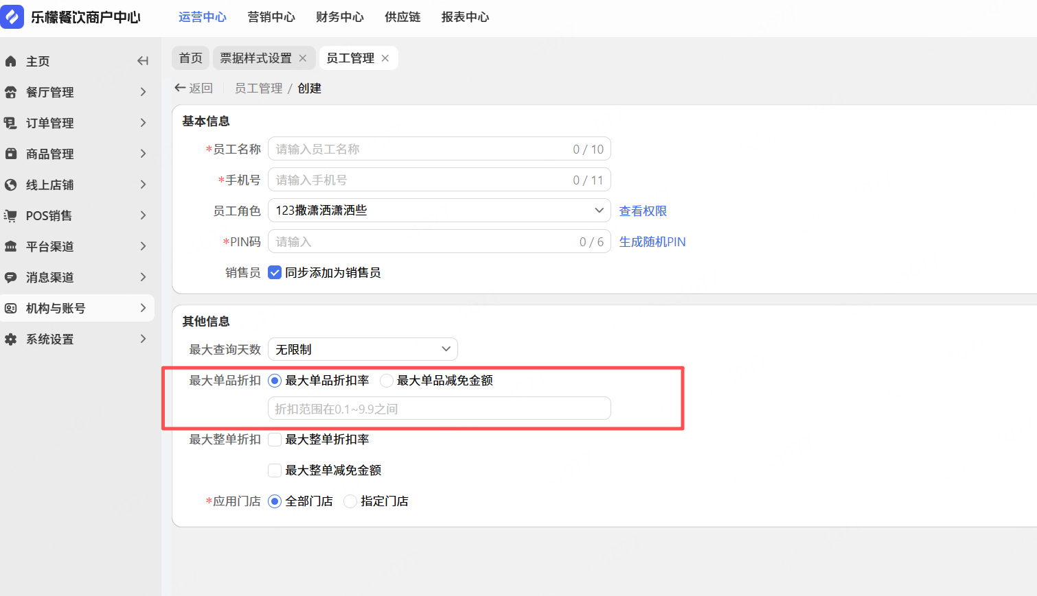 员工管理中最大整单折扣中的‘最大整单折扣率’与‘最大整单减免金额’拆分为独立应用,分别应用于以下配置