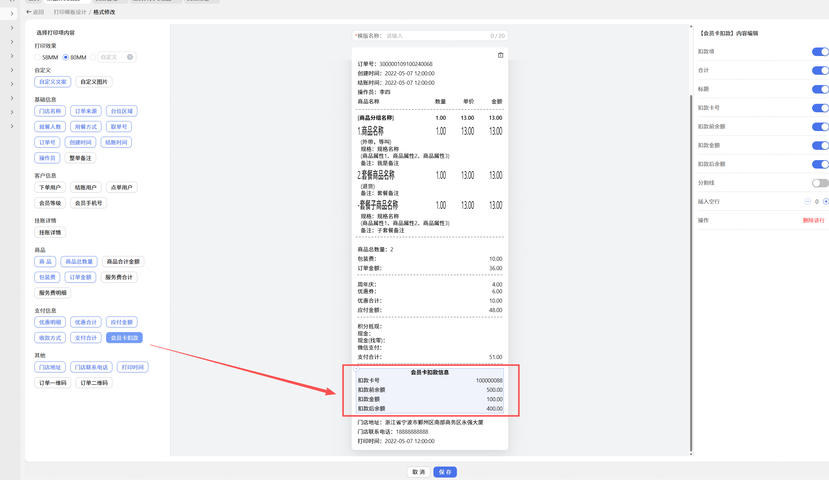 【全POS】堂食结账单支持打印零售储值卡相关信息