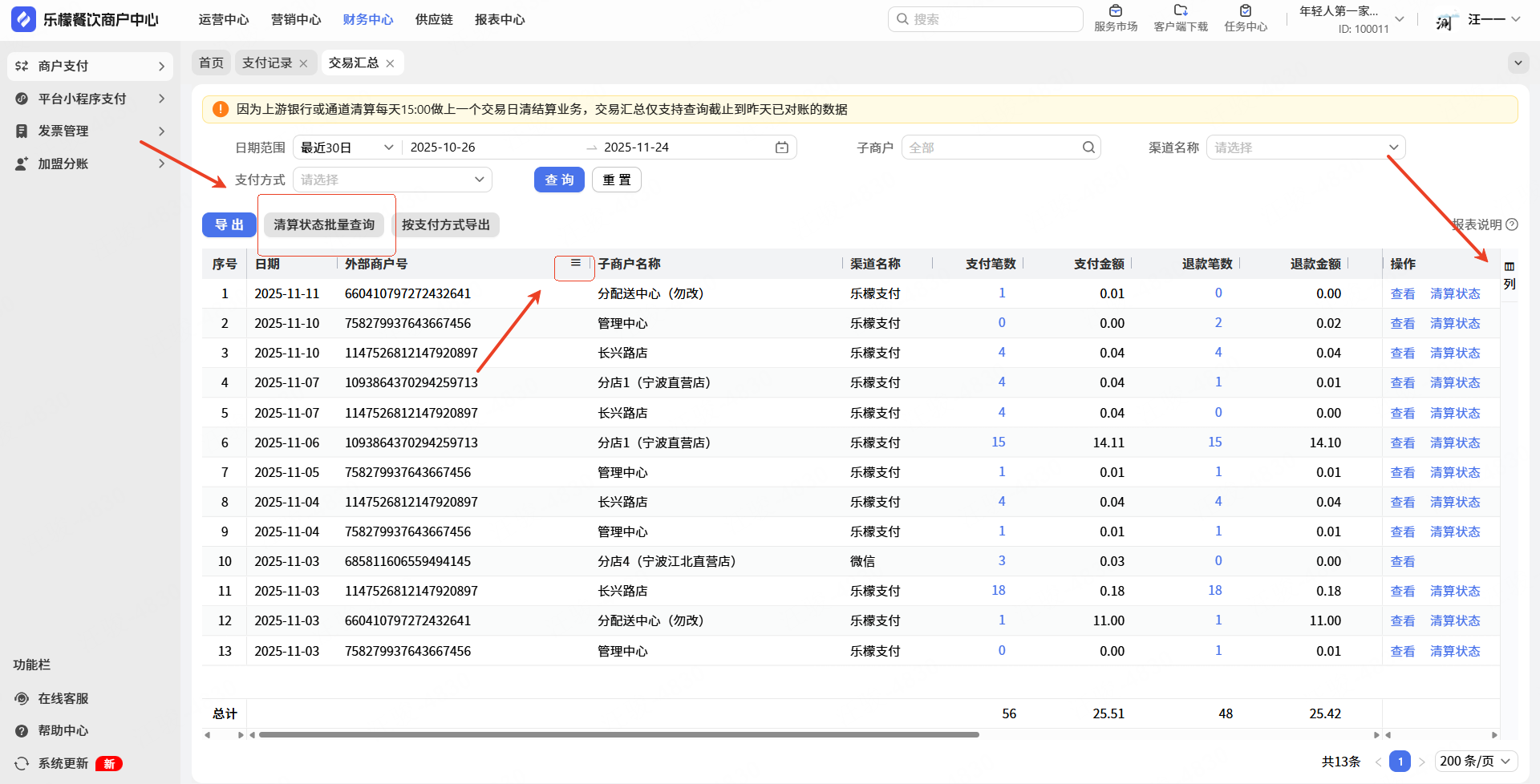 1.交易汇总增加清算状态批量查询,支持自定义列和操作列(固定在左侧/列宽自适应)