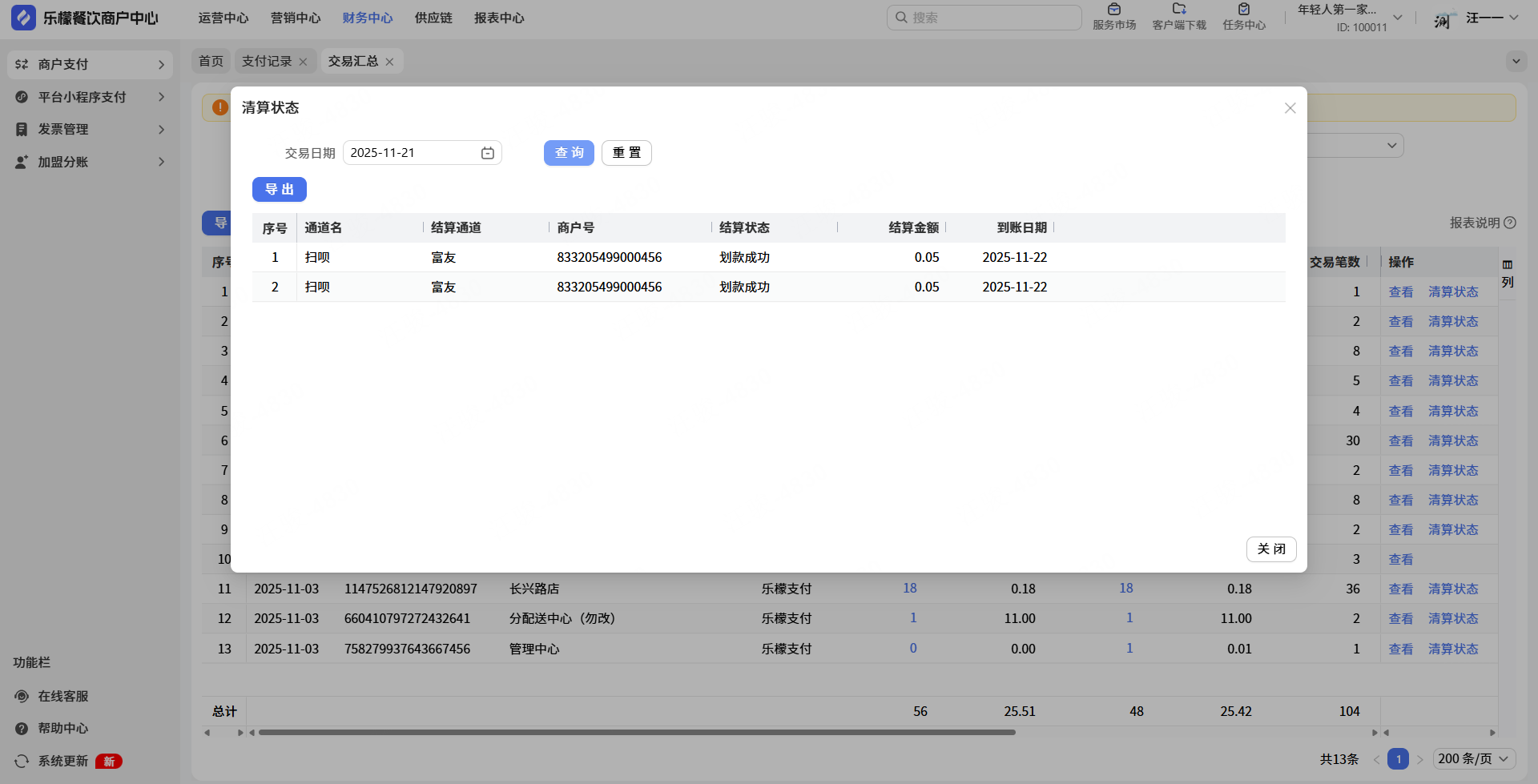 点击查看清算结果,支持搜索交易日期,列表中展示到账日期。