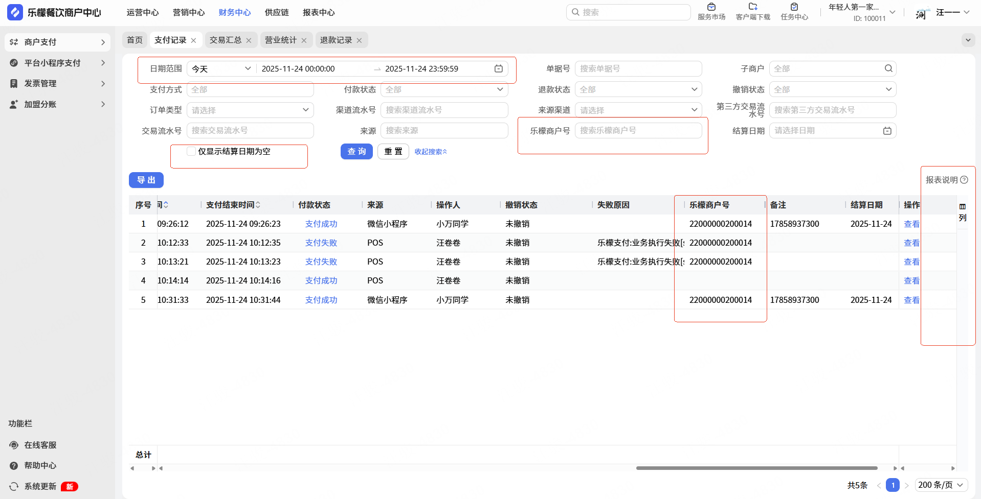 增加【乐檬商户号】和【仅显示结算日期为空】的筛选,其中乐檬商户号为支付进件时的商户号