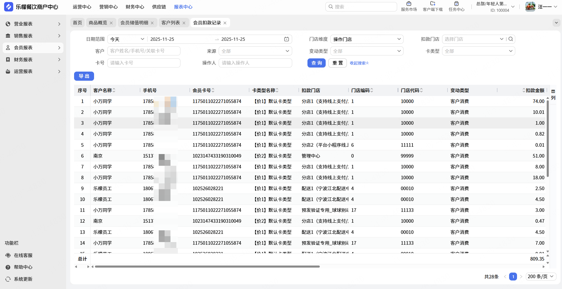 查询会员/会员卡储值期末余额