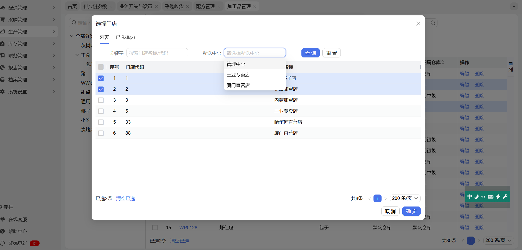 加工品下发时,可选择所有门店进行下发,可在选择门店弹窗筛选指定配送中心下的门店