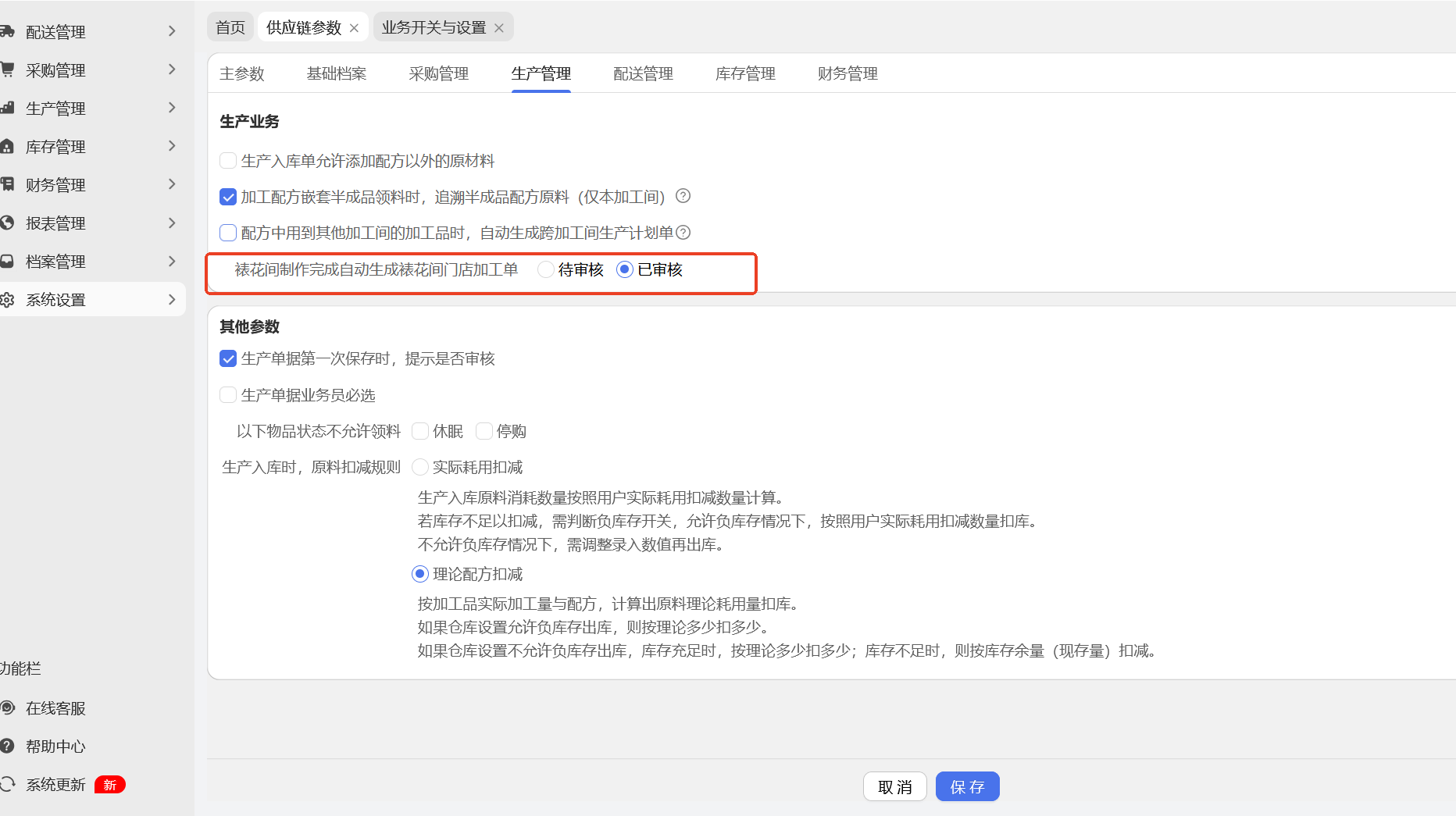 裱花间在制作完成时将生成门店加工单,并增加参数“裱花间制作完成自动生成裱花间门店加工单”,可选择生成的门店加工单的单据状态。