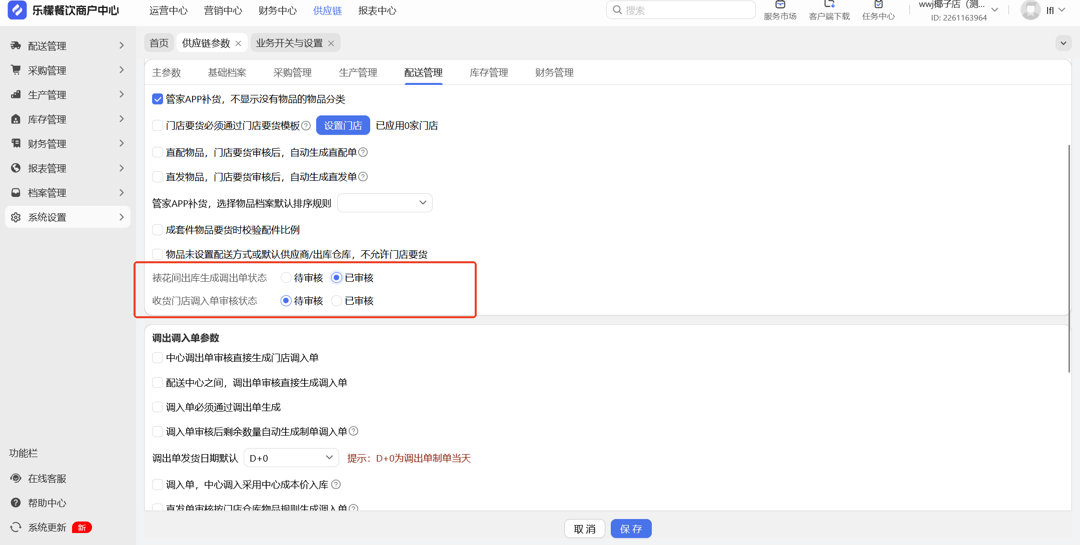 若裱花间与发货门店不为同一门店,裱花间操作“发货”动作时,生成裱花间的调出单,并增加参数“裱花间出库生成调出单状态”及“收货门店调入单审核状态”,可控制对应单据的审核状态