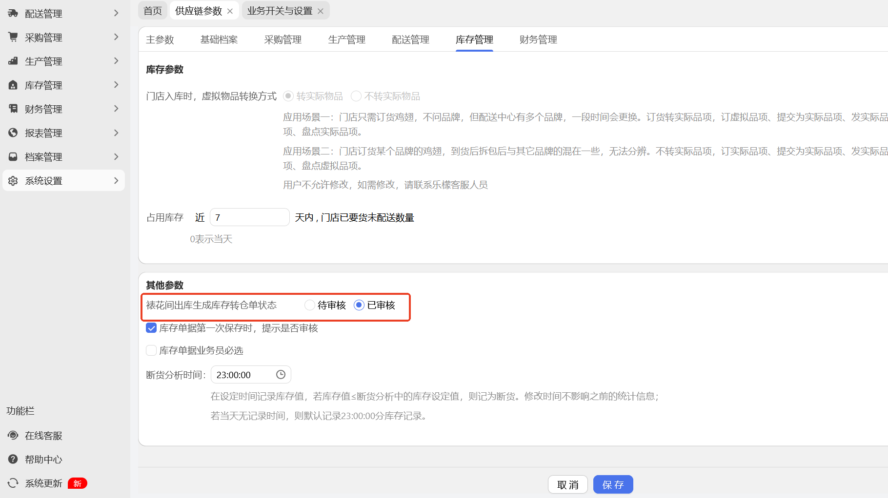 若裱花间与发货门店为同一门店,且裱花仓库与销售仓库不为同一仓库,裱花间操作“发货”动作时,生成裱花间的库存转仓单,并增加参数“裱花间出库生成库存转仓单状态”,可控制对应单据的审核状态