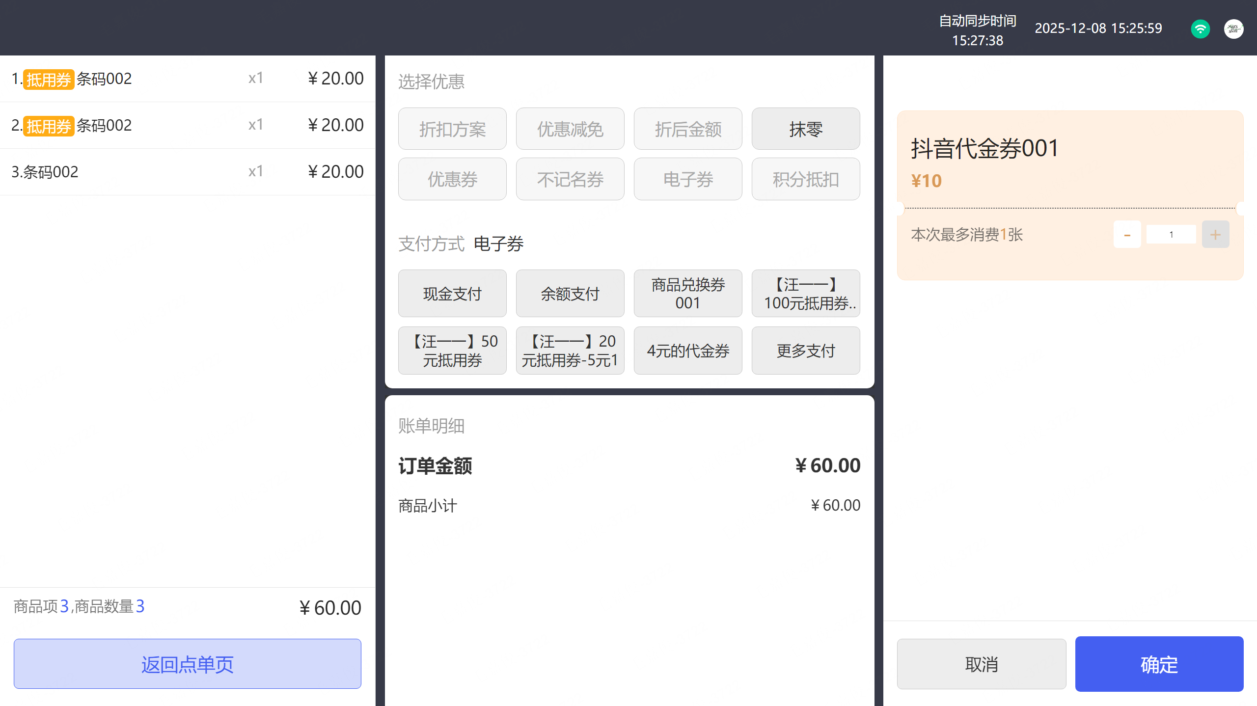 电子券应用规则以所绑定对应代金券规则为准,电子券仅做核销操作