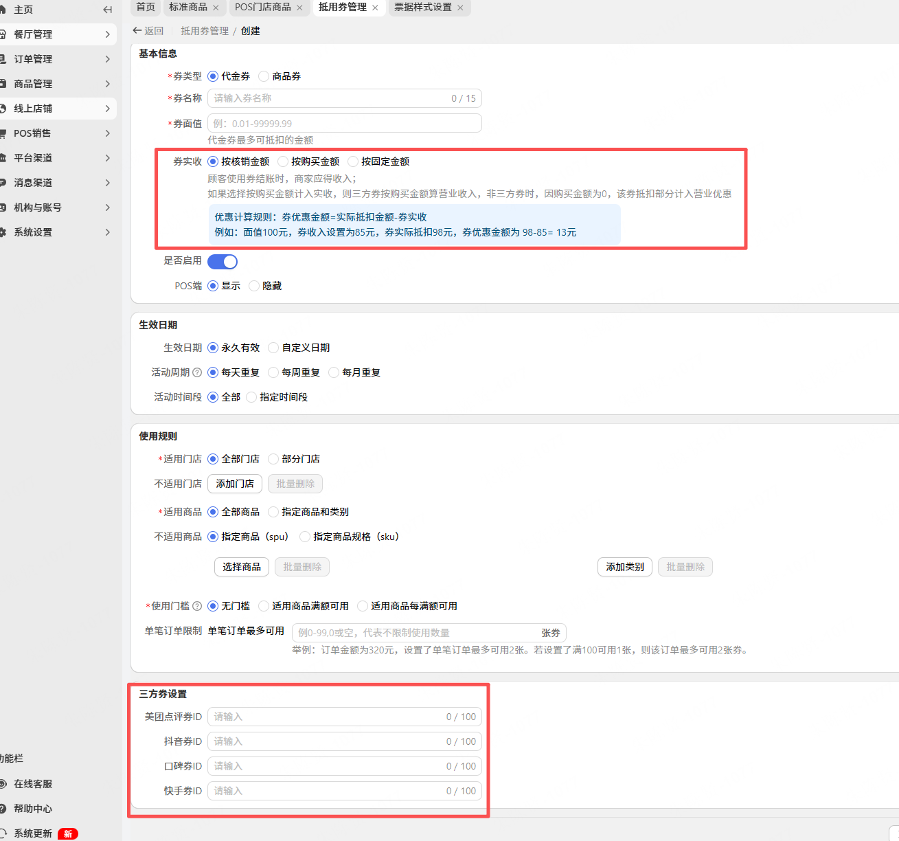 抵用券功能增加三方券设置,可按对应平台的券ID填入