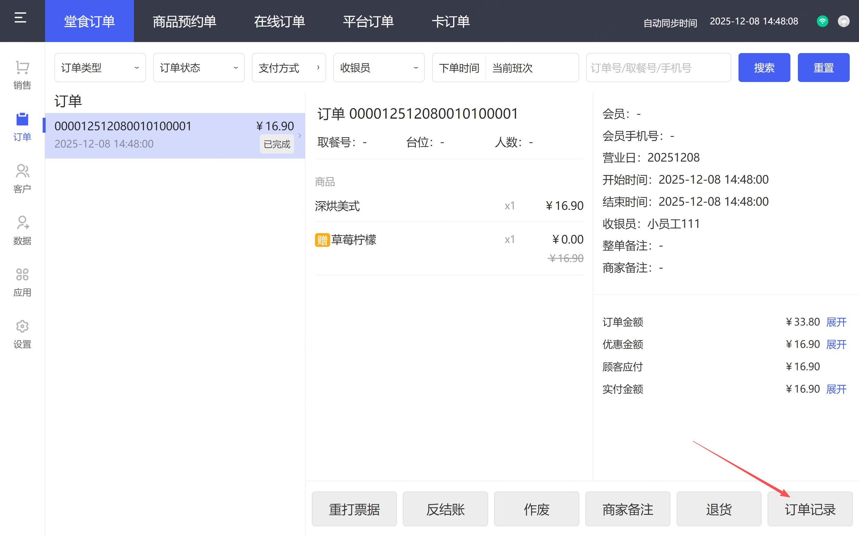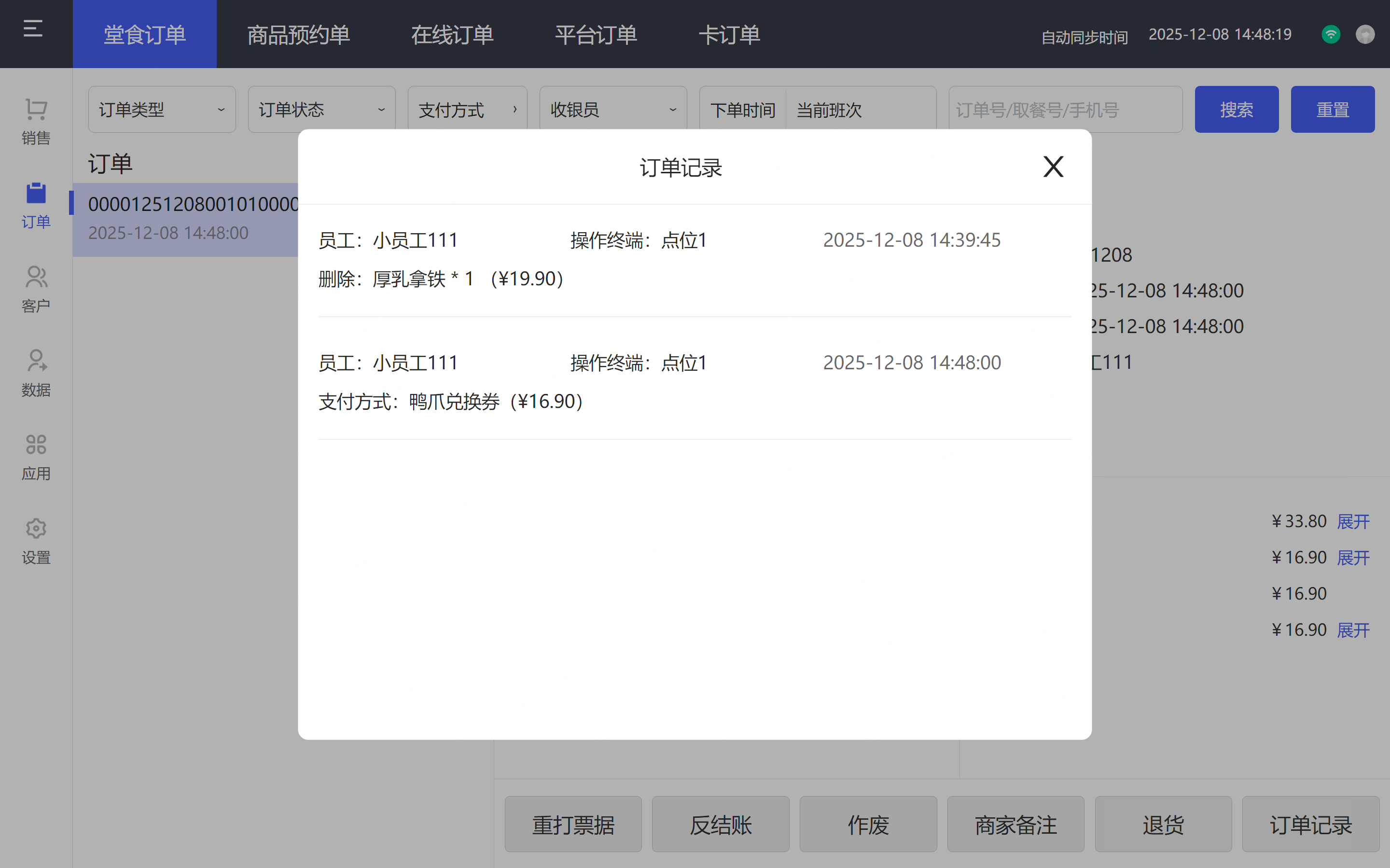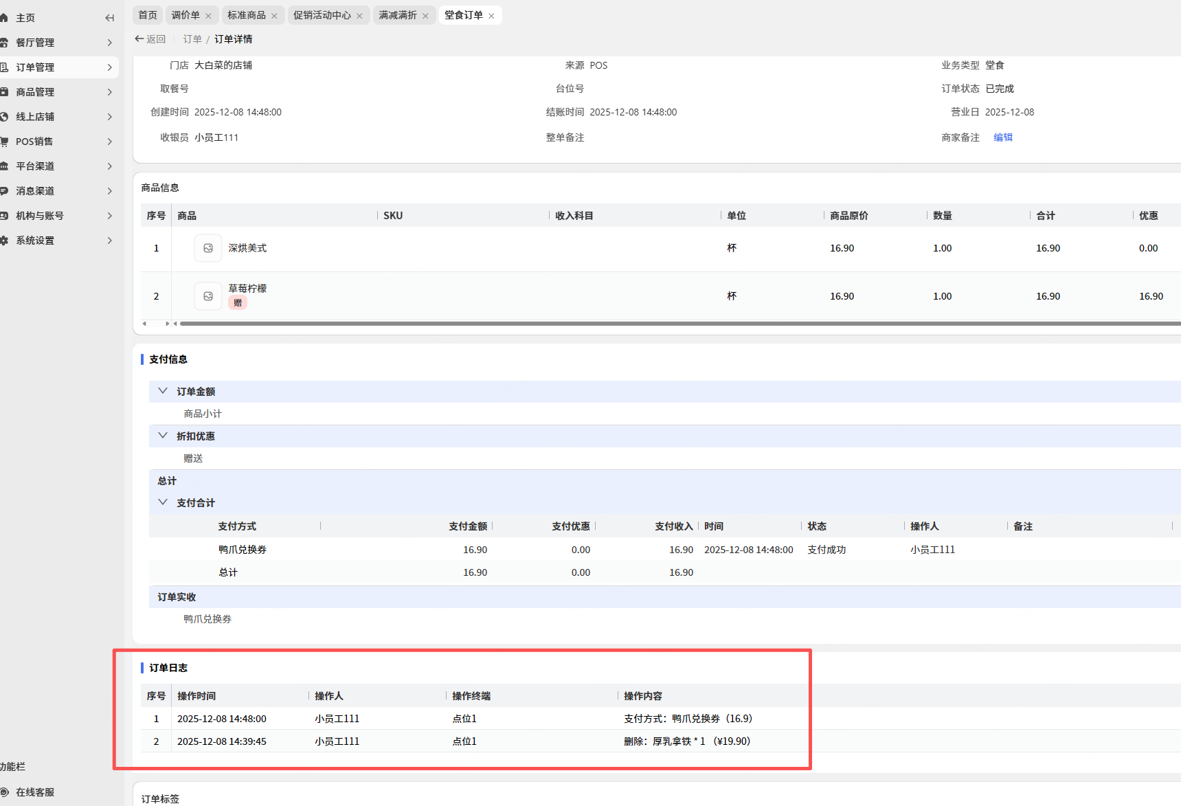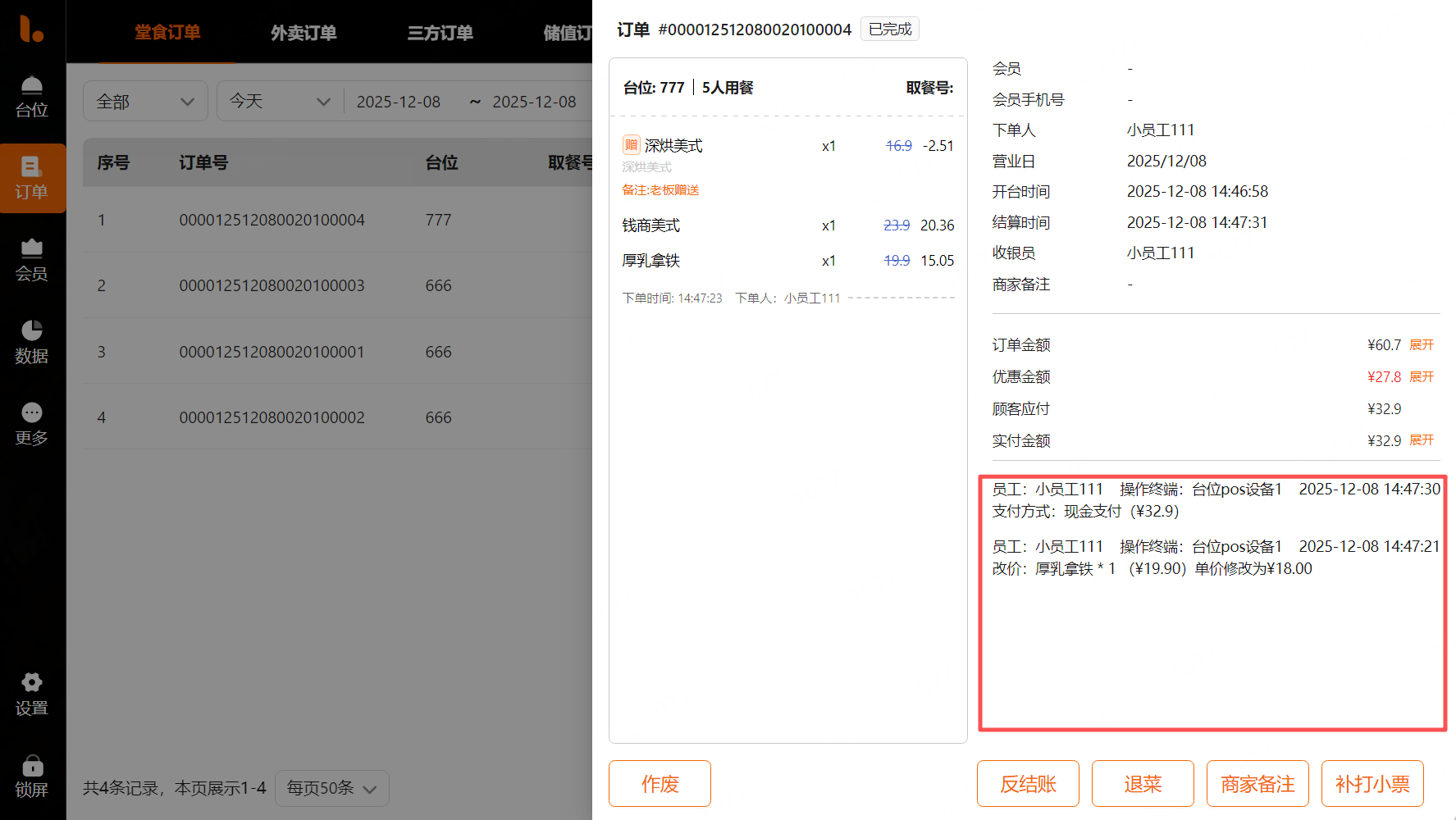 网页堂食订单明细中增加订单操作记录,可查看关于桌台操作、菜品操作、优惠/结算录入与撤销以及结算后的订单操作。