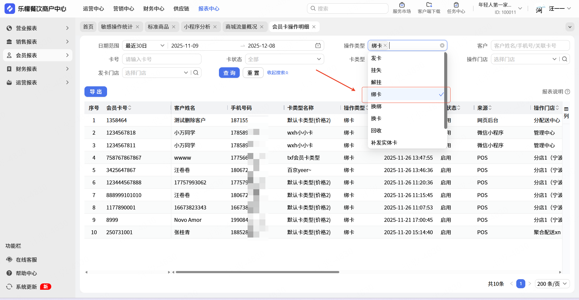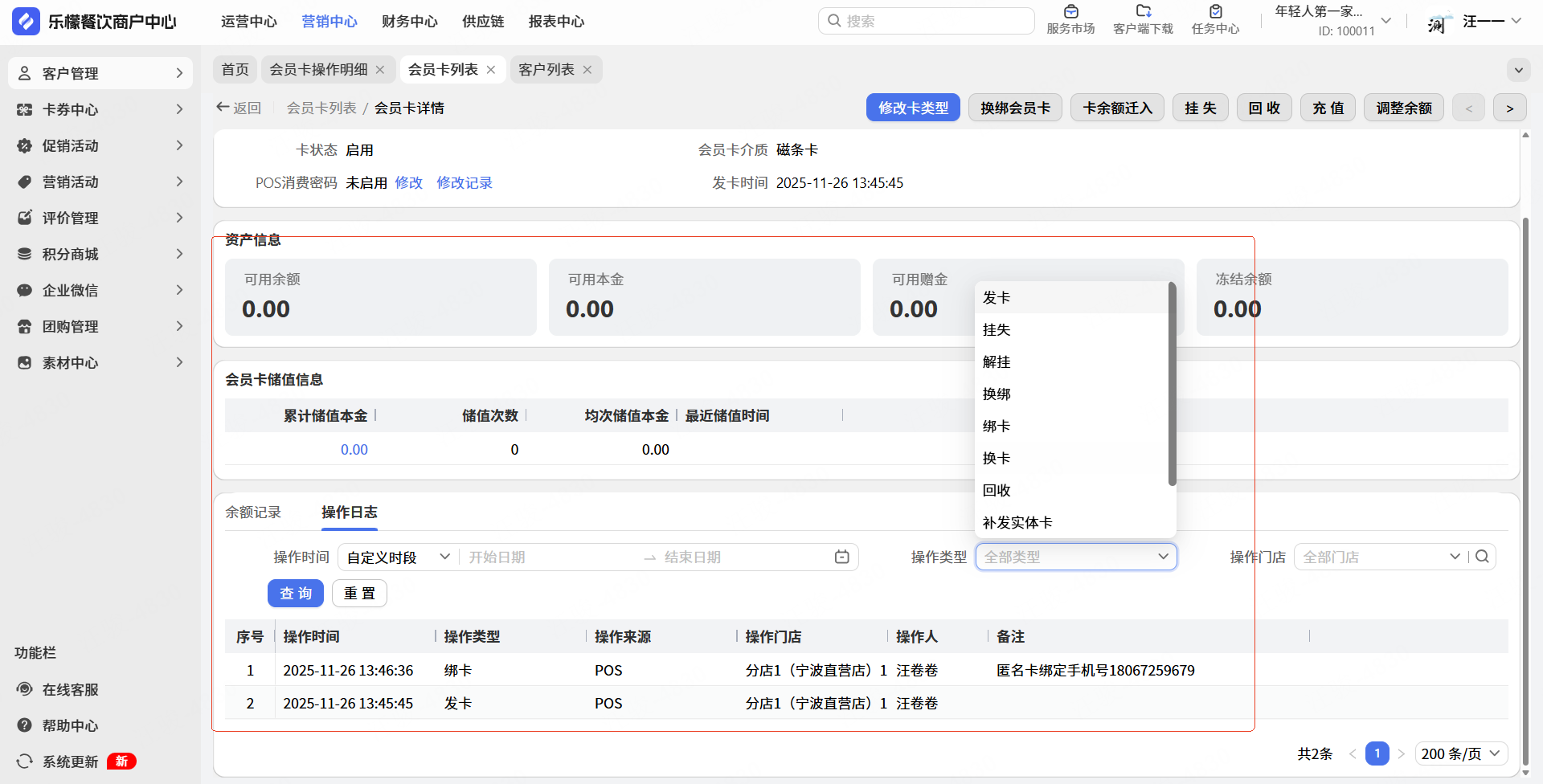 2.会员卡详情页日志与会员卡操作明细一致,支持查看不同的操作类型,包括:发卡、挂失、解挂、换绑、绑卡、换卡、回收、补发实体卡、修改卡类型、修改密码。