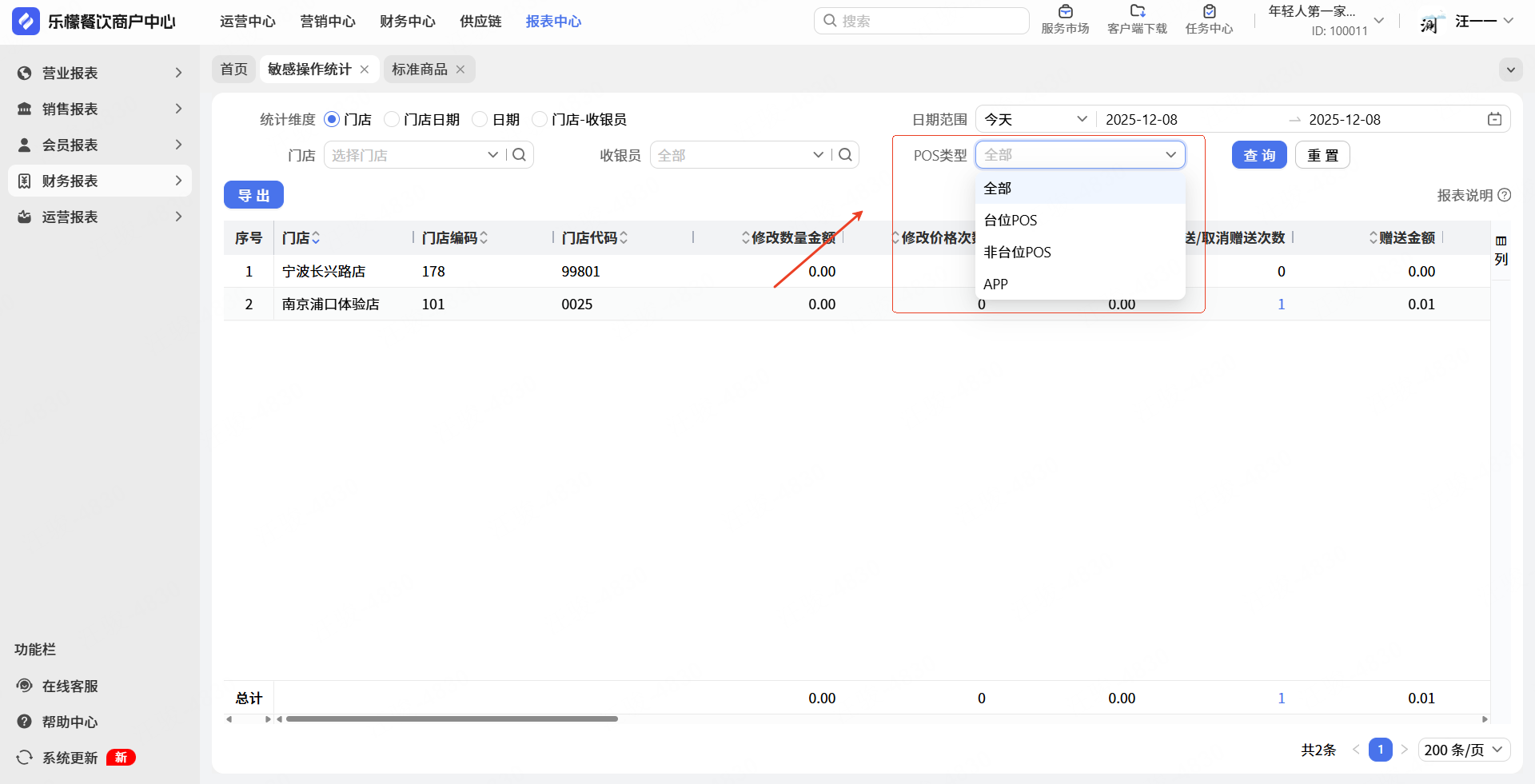 3.敏感操作分析支持筛选台位POS和非台位POS的操作记录。