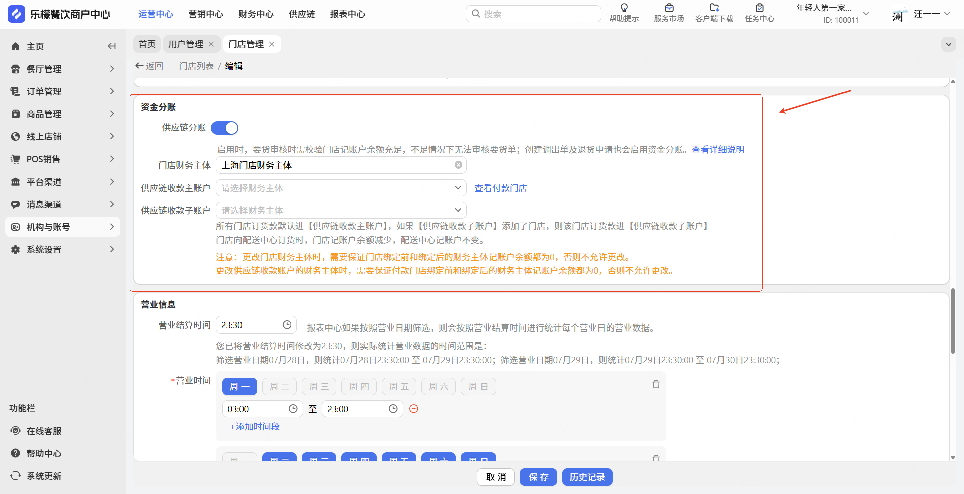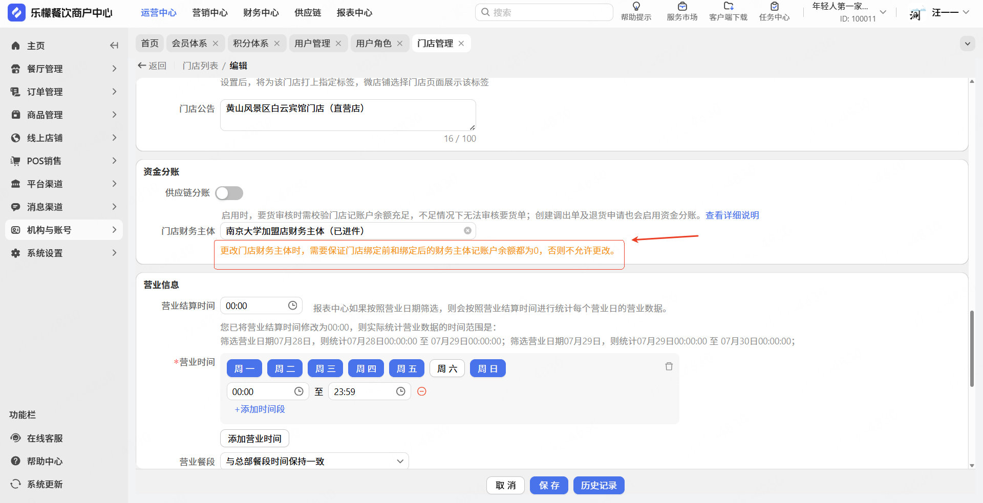 2.针对配送中心(或者叫分仓),更改门店财务主体时,需要保证门店绑定前和绑定后的财务主体记账户余额都为0,否则不允许更改。