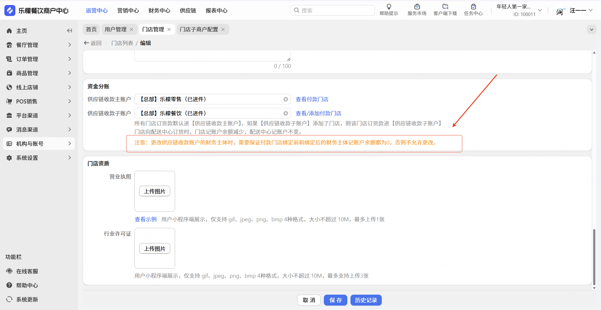 3.针对门店,更改供应链收款账户的财务主体时,需要保证付款门店绑定前和绑定后的财务主体记账户余额都为0,否则不允许更改。
