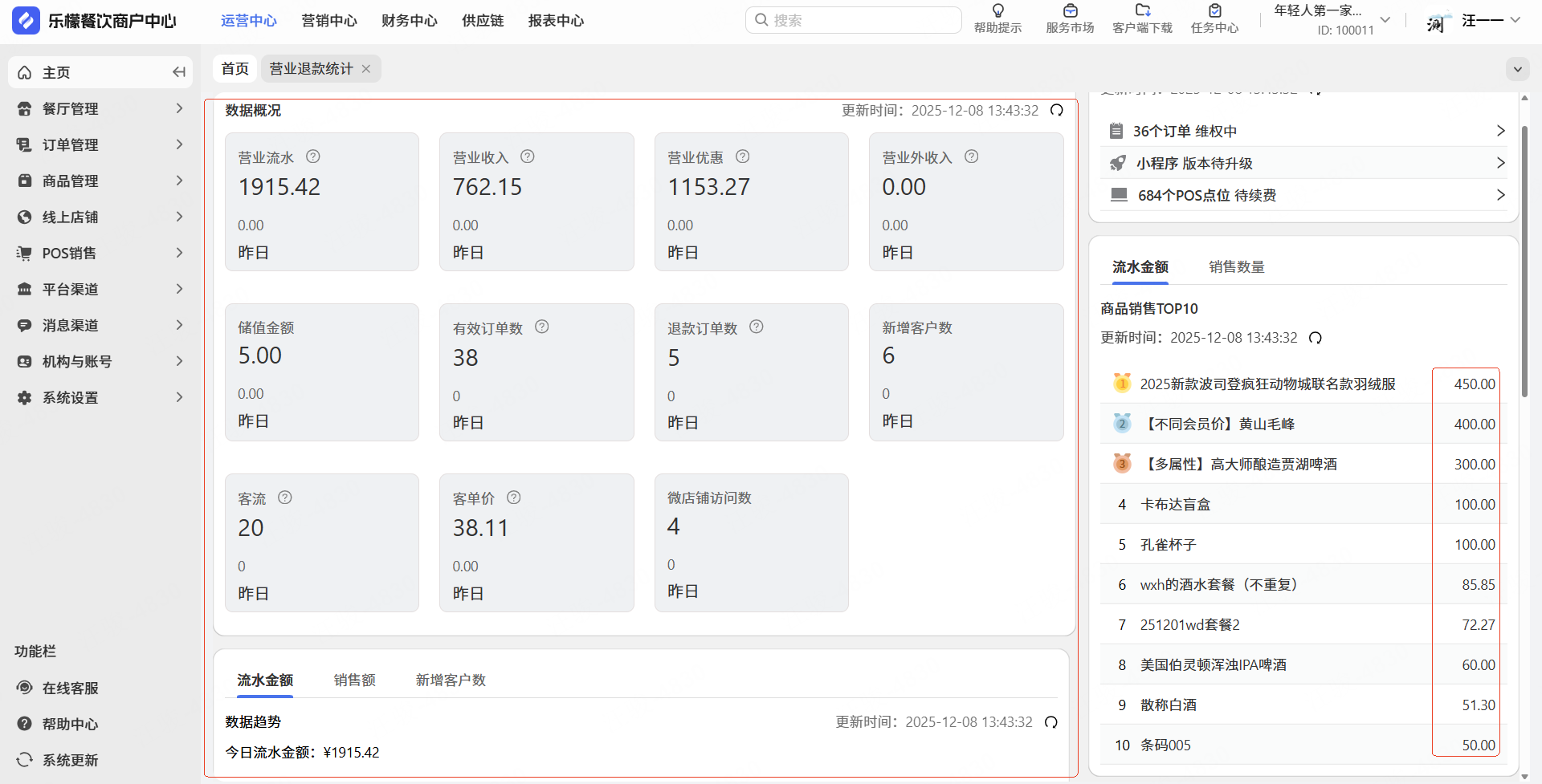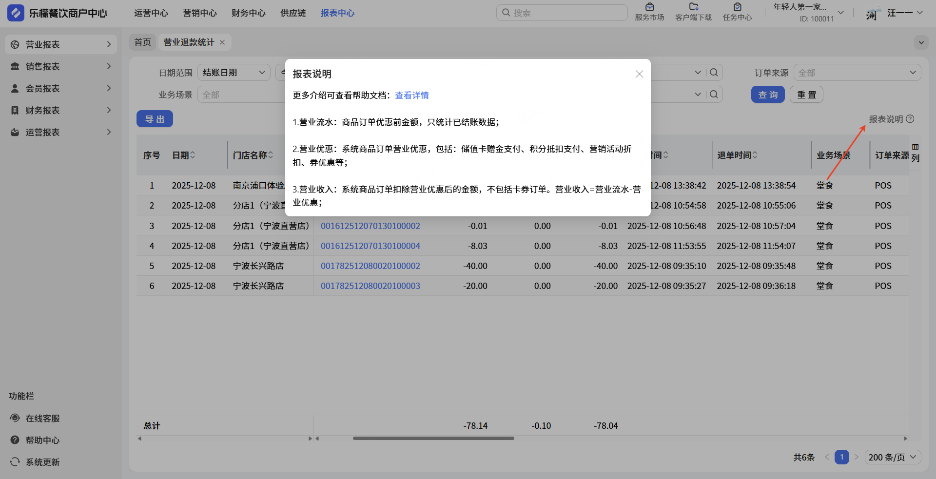 营业退款统计、服务费统计、会员储值明细、会员扣款记录、原材料销售消耗报表