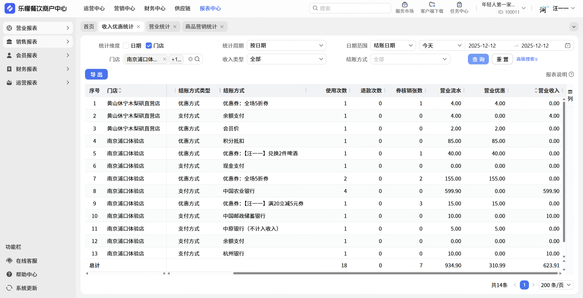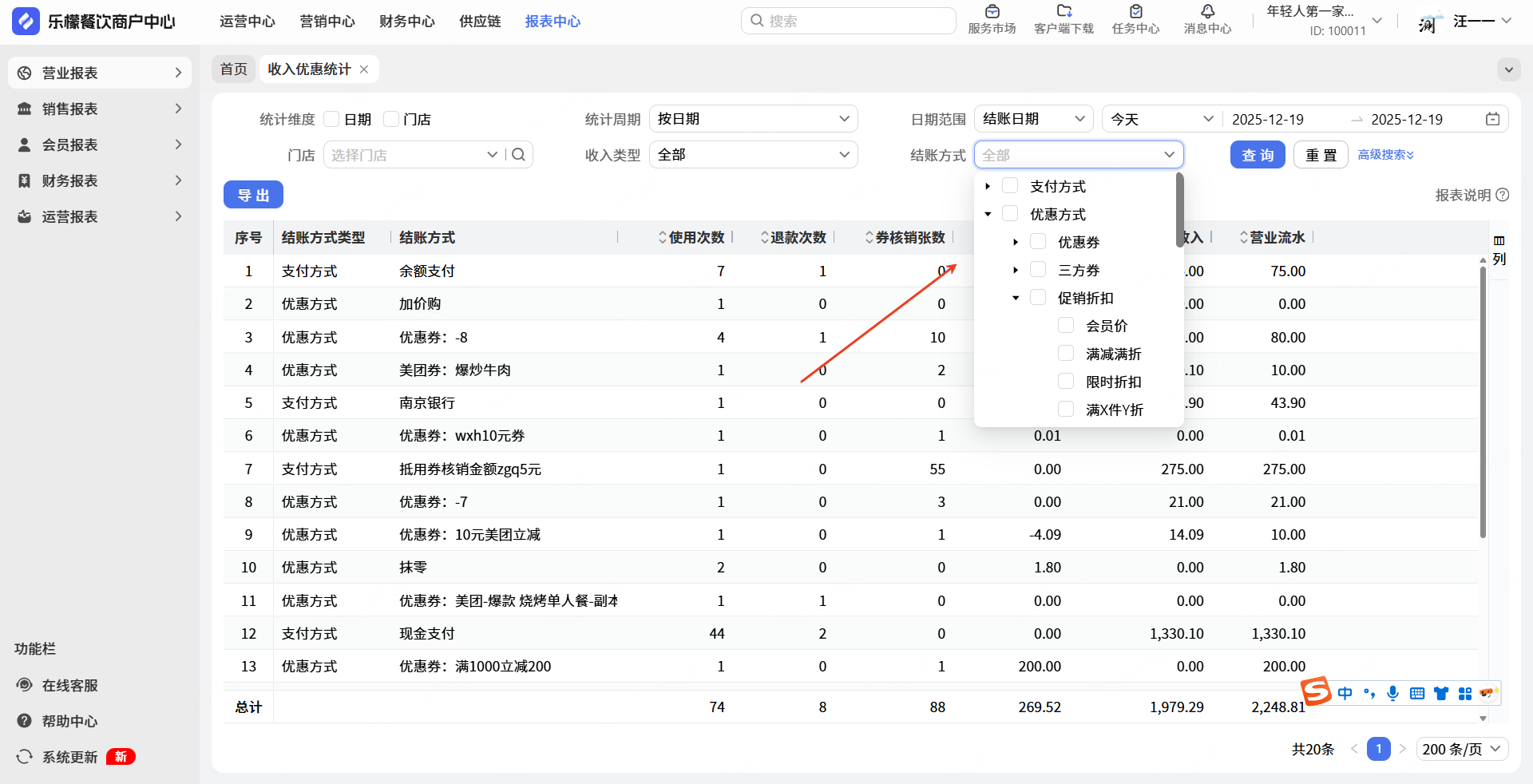需要查看系统不同支付方式和优惠数据。