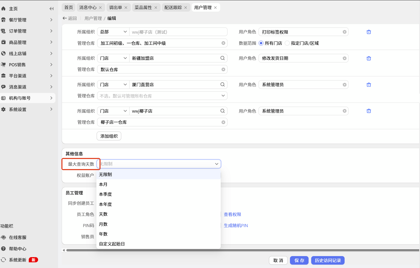 APP供应链模块功能及报表应用用户管理的最大查询天数