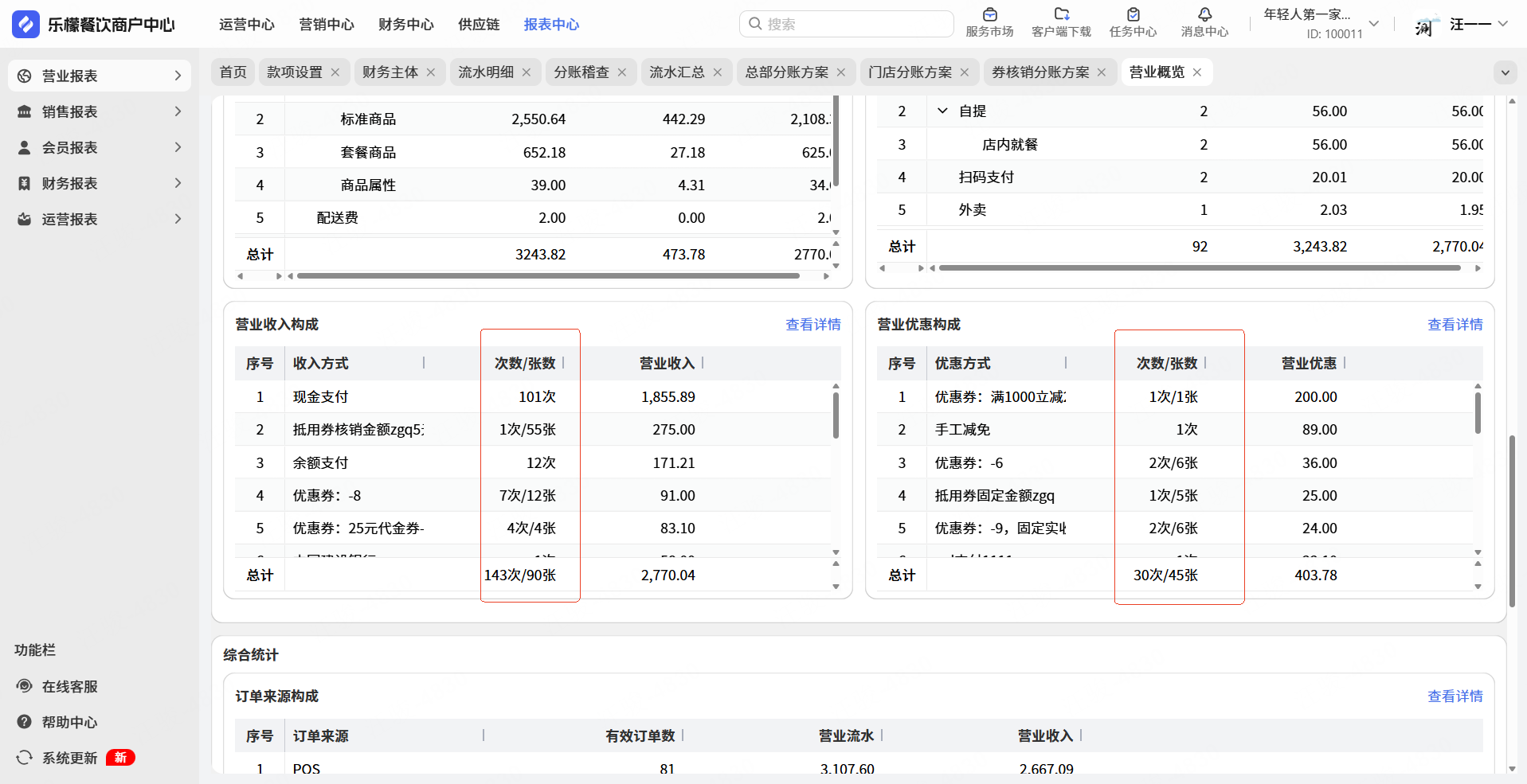 营业概览、营业收入构成、营业优惠分析、收入优惠统计、交班统计等