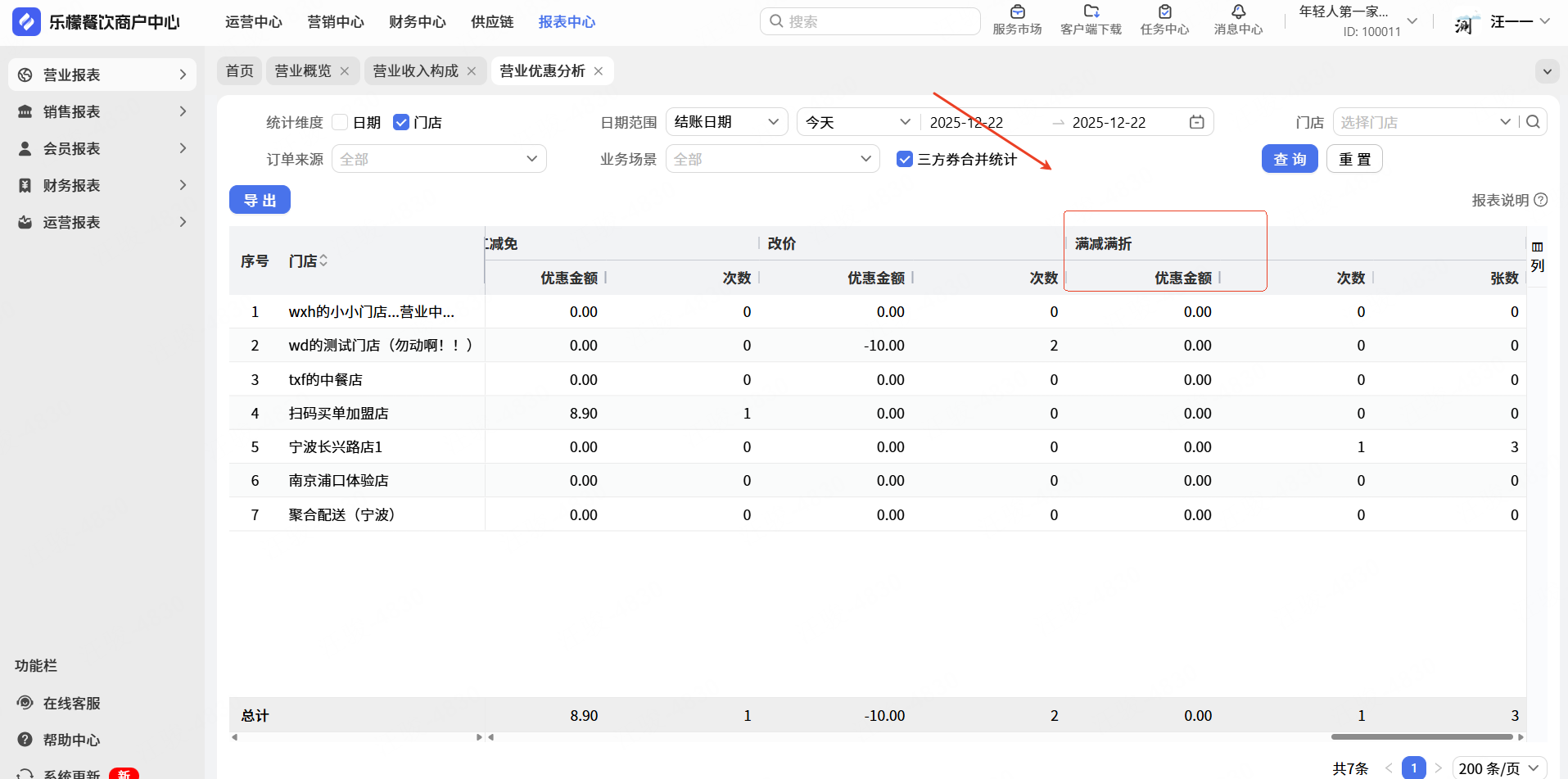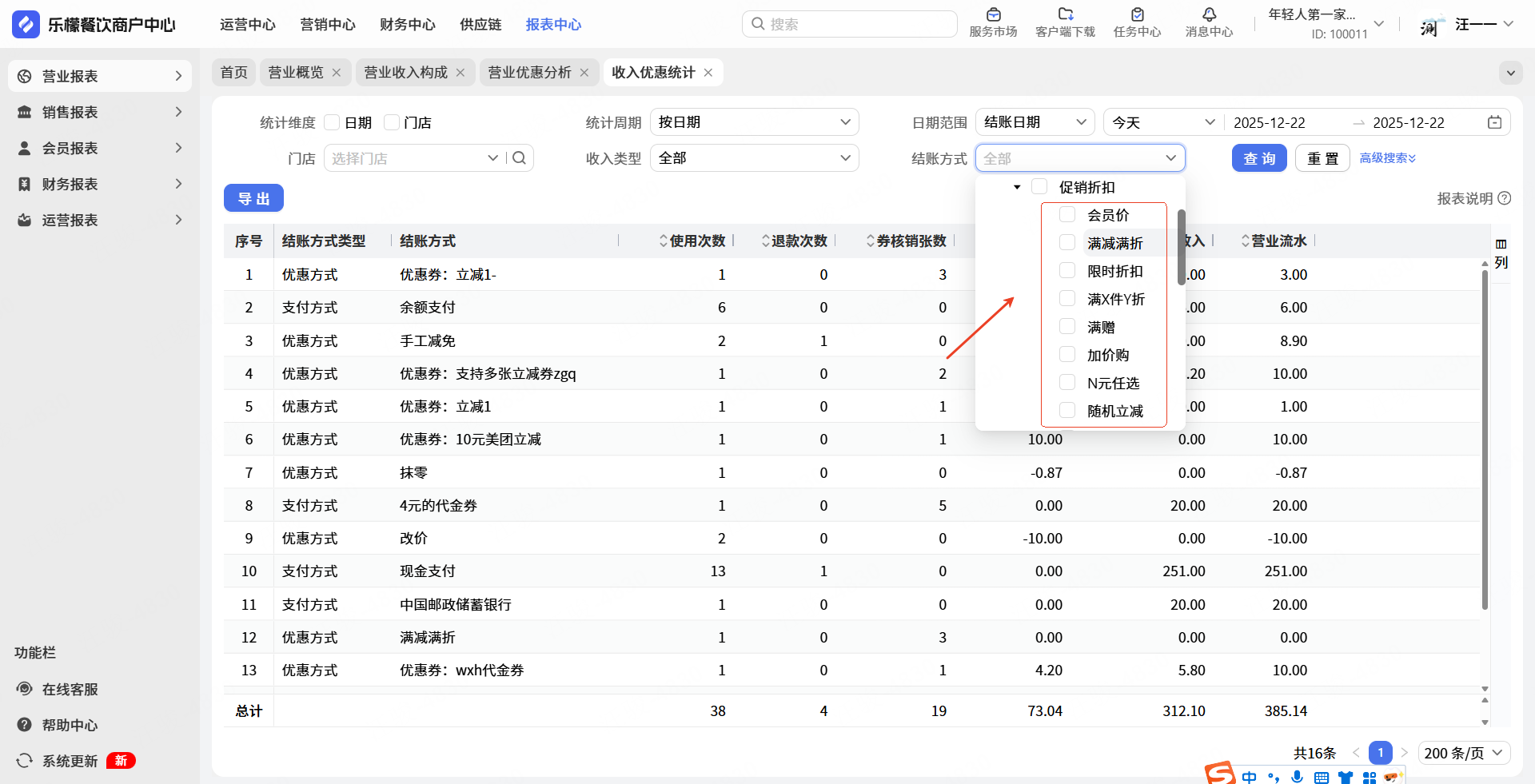 2.营业优惠相关报表,折扣优惠支持细分,包括:会员价、限时折扣、满减满折、满赠、加价购、N元任选、随机立减、新客专享、群接龙、拼团、减运费、权益卡减运费、权益卡减包装费