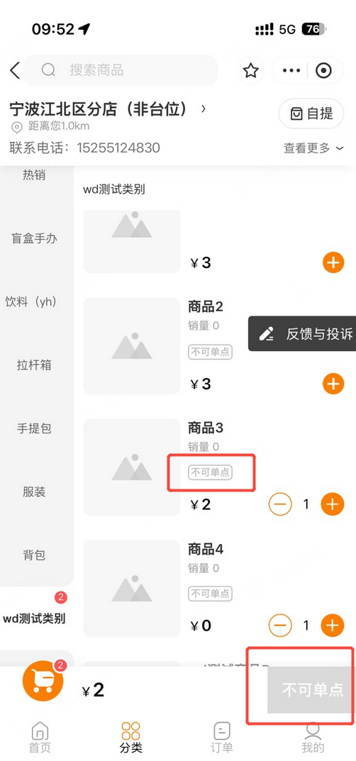 自提,单点时,结算按钮显示“不可单点”且不可点击;