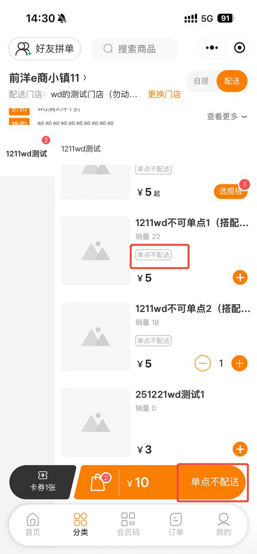 配送,显示标签“单点不配送”,在会员价、会员折扣等标签后面;