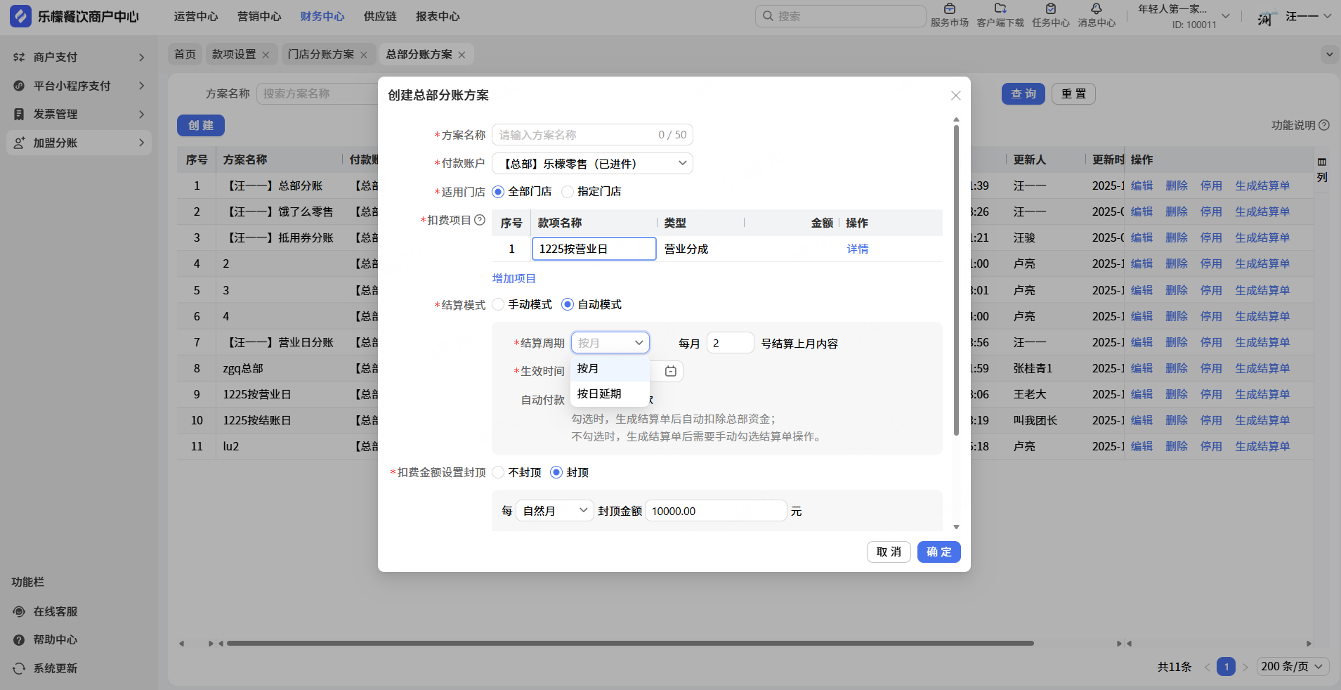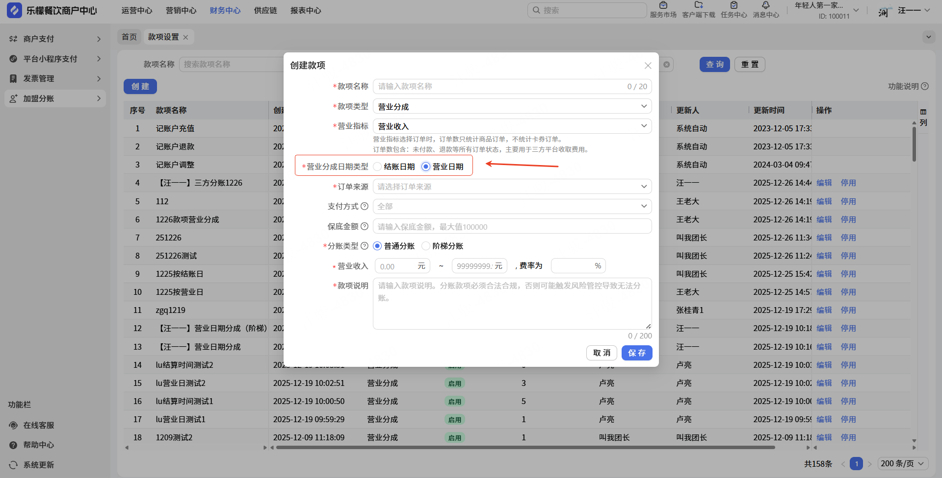 2.门店分账方案及总部分账方案支持选择按营业日期的款项