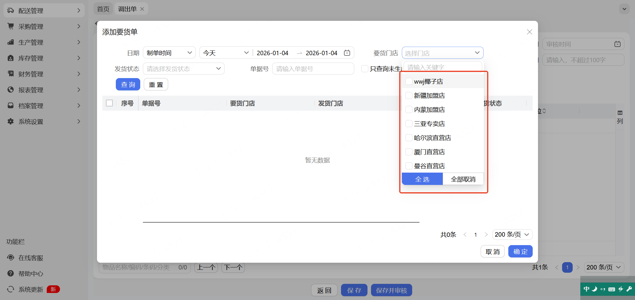 总部在网页新增调出单选择“关联要货单”时,要货门店筛选项,只展示当前配送网络内的门店