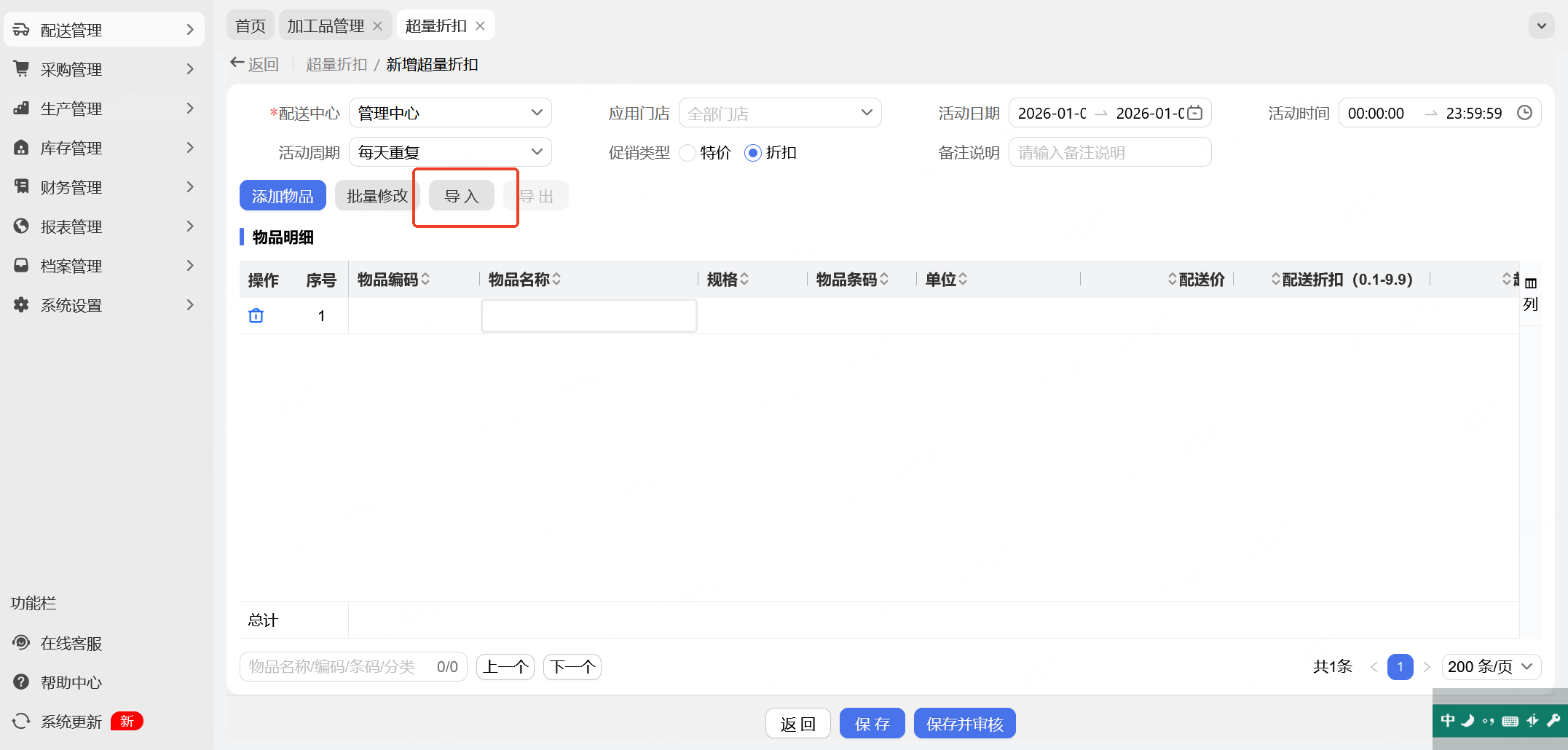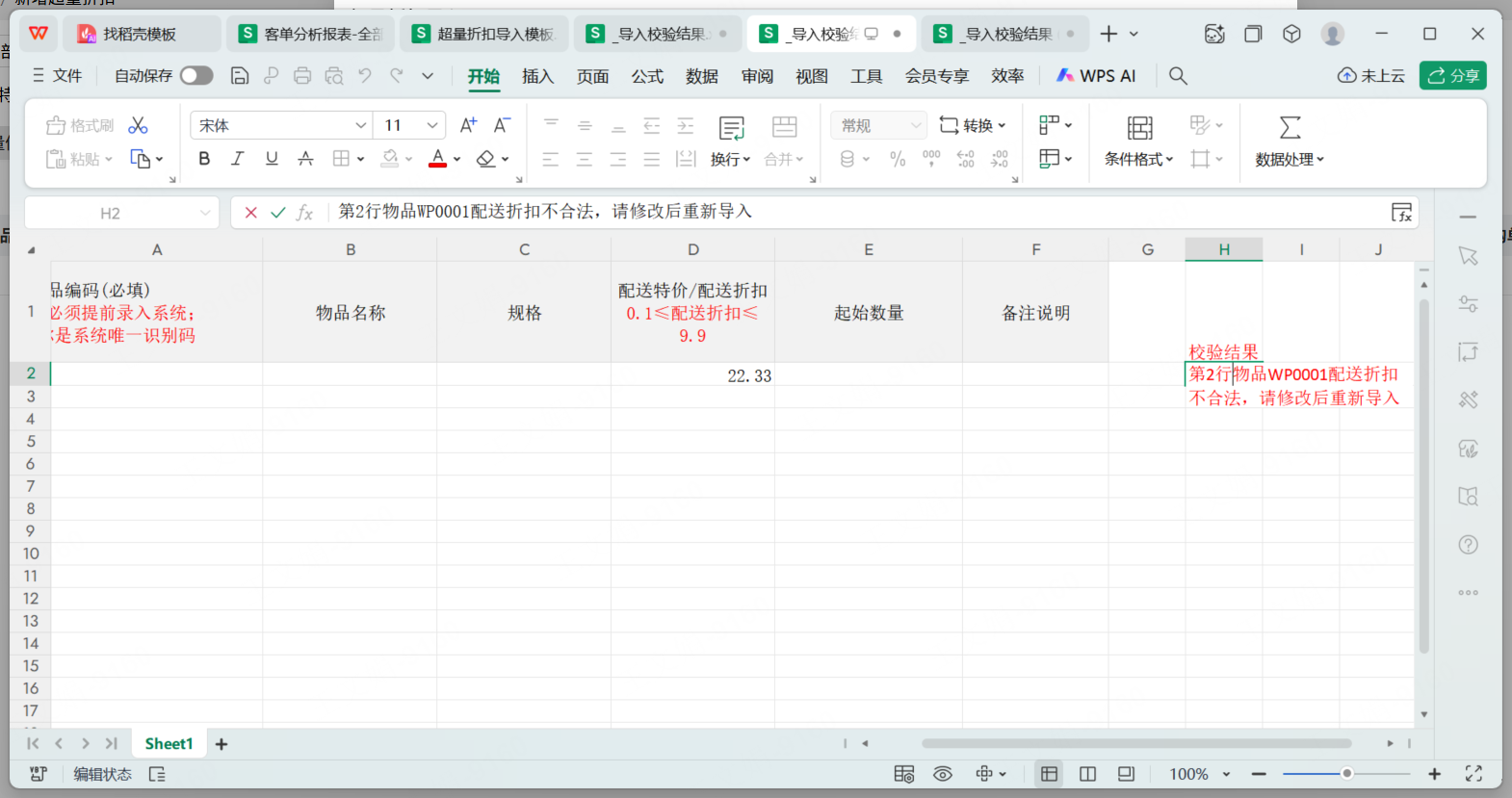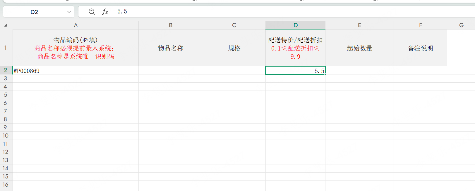 若超量折扣的促销类型为“折扣”时,导入模板的配送折扣不在0.1-9.9范围中,则会导入失败
