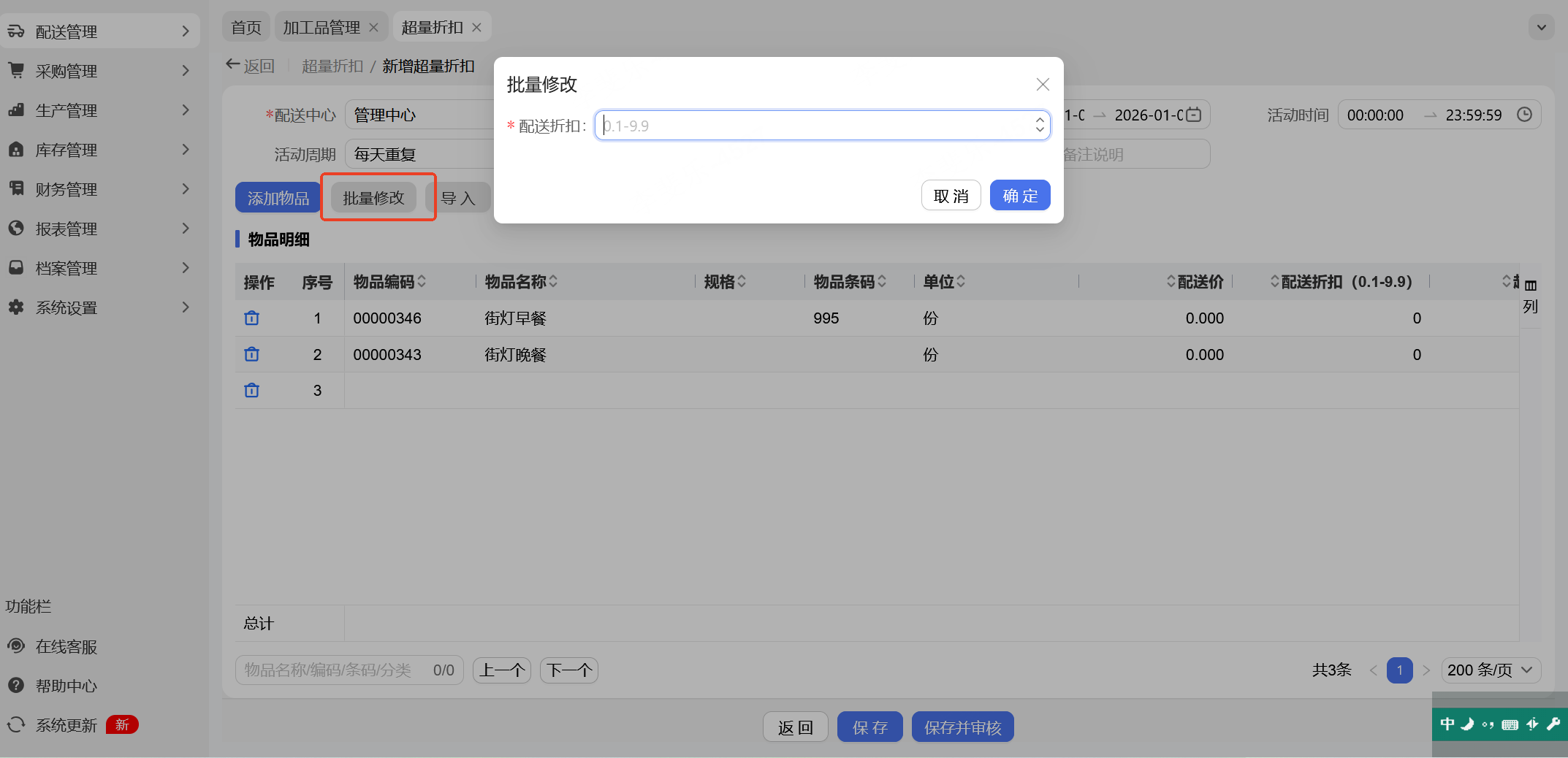 若超量折扣的促销类型为“折扣”时,录入物品后,支持快速修改折扣