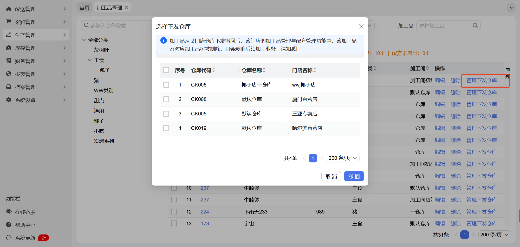 列表操作列增加功能“管理下发仓库”,点击后,可查看该物品已下发的仓库,并可快速勾选仓库,撤回下发。