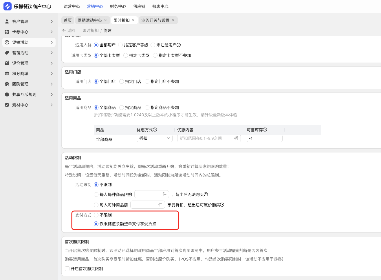 共享互斥环境,限制折扣活动,活动限制,增加支付方式限制。默认无限制,可选仅限储值余额整单支付享受折扣。