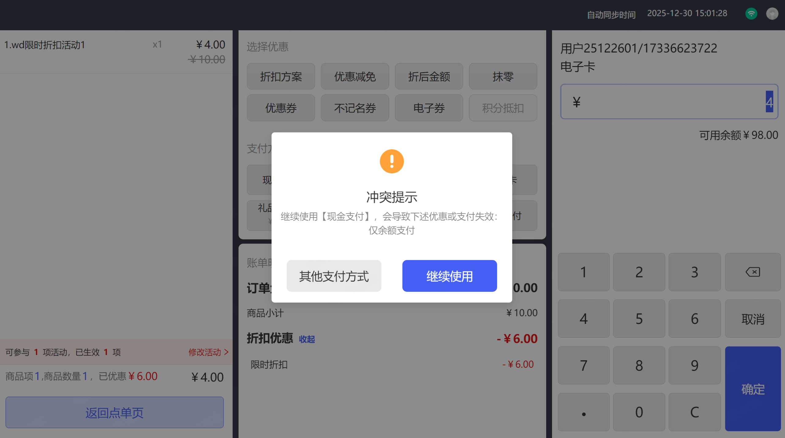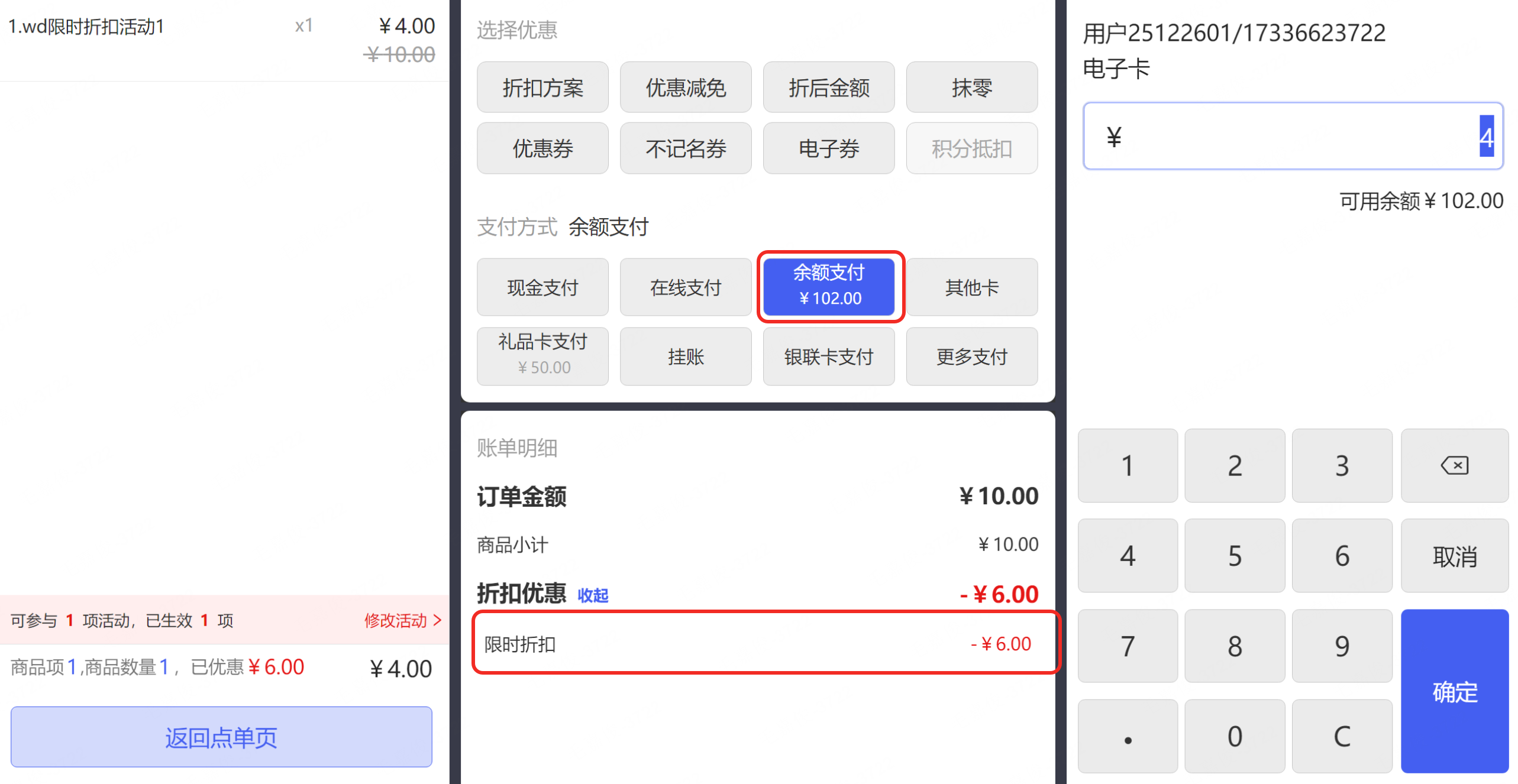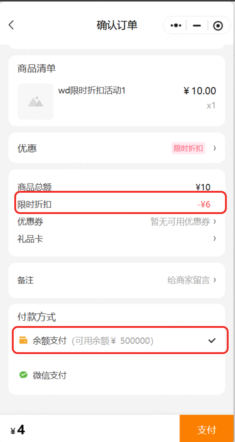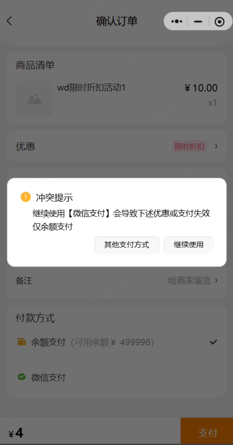 限时折扣活动和余额支付共享时: